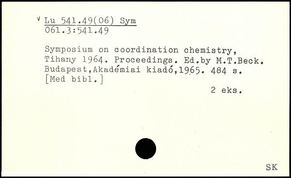 Symposium on coordination chemistry, Tihany 1964. Proceedings. Ed.by M.T.Beck.