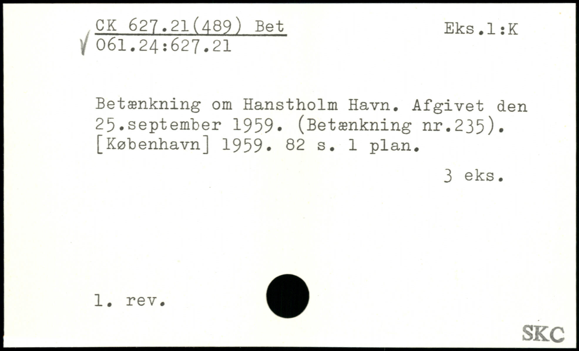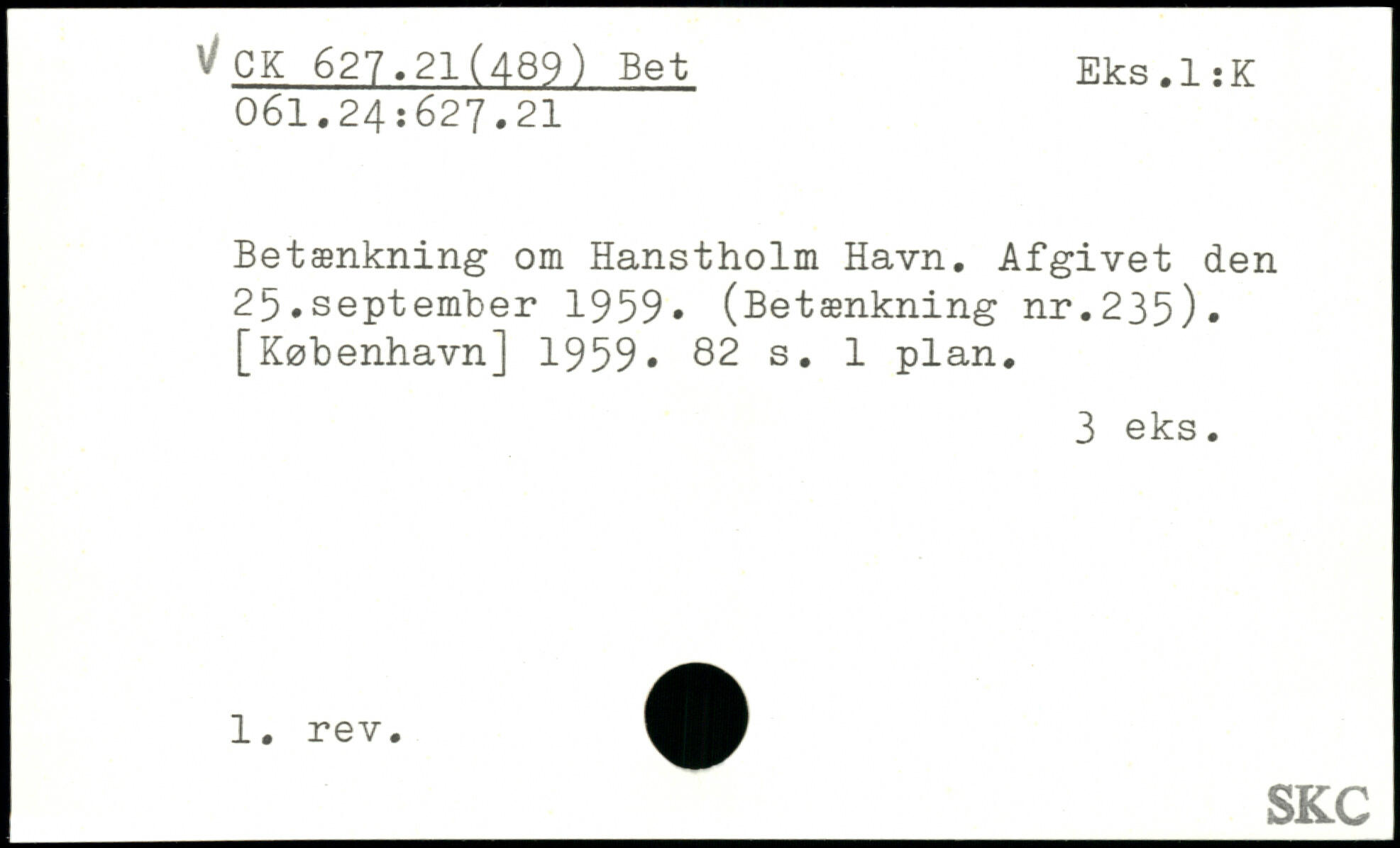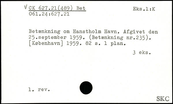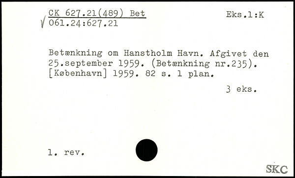 Betænkning om Hanstholm Havn. Afgivet den 25.september 1959, (Betænkning nr.235)