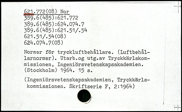 Normer för tryckluftbehållare. (Luftbehål-larnormer). Utarb.og utg.av Tryckkärlskom-missionen, Ingeniörsvetenskapsakademien. (Stockholm) 1964. I