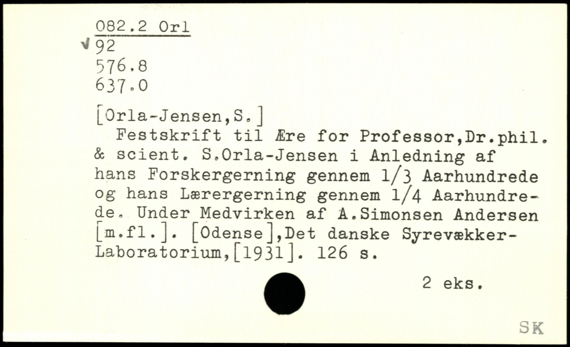 [Orla-Jensen,S.J Festskrift til Ære for Professor,Dr.phil. & scient. S.Orla-Jensen i Anledning af hans Forskergerning gennem 1/3 Aarhundrede og hans Lærergerning gennem 1/4 Aarhundrede. Under Medvirken af A.Simonsen Andersen [m.fl.]. [Odense],Det danske Syrevækker- Lahoratorium,[1931].