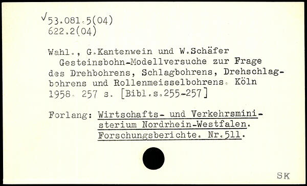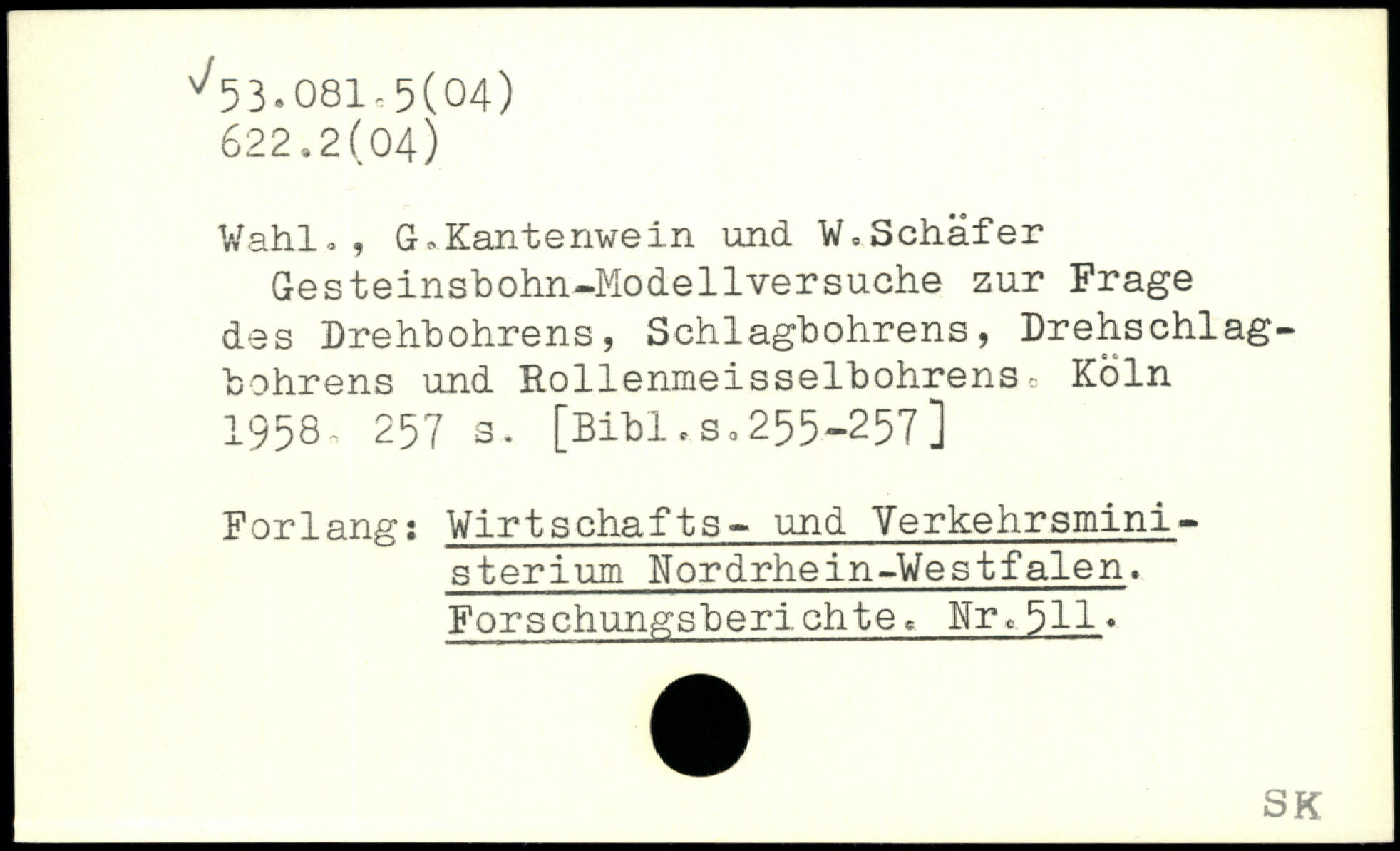 Wahl, , G,Kantenwein und W.Schäfer Gesteinsbohn-Modellversuche zur Frage des Drehbohrens, Schlagbohrens, Drehschlag- \ bohrens und Rollenmeisselbohrense Köln ; 1958-
