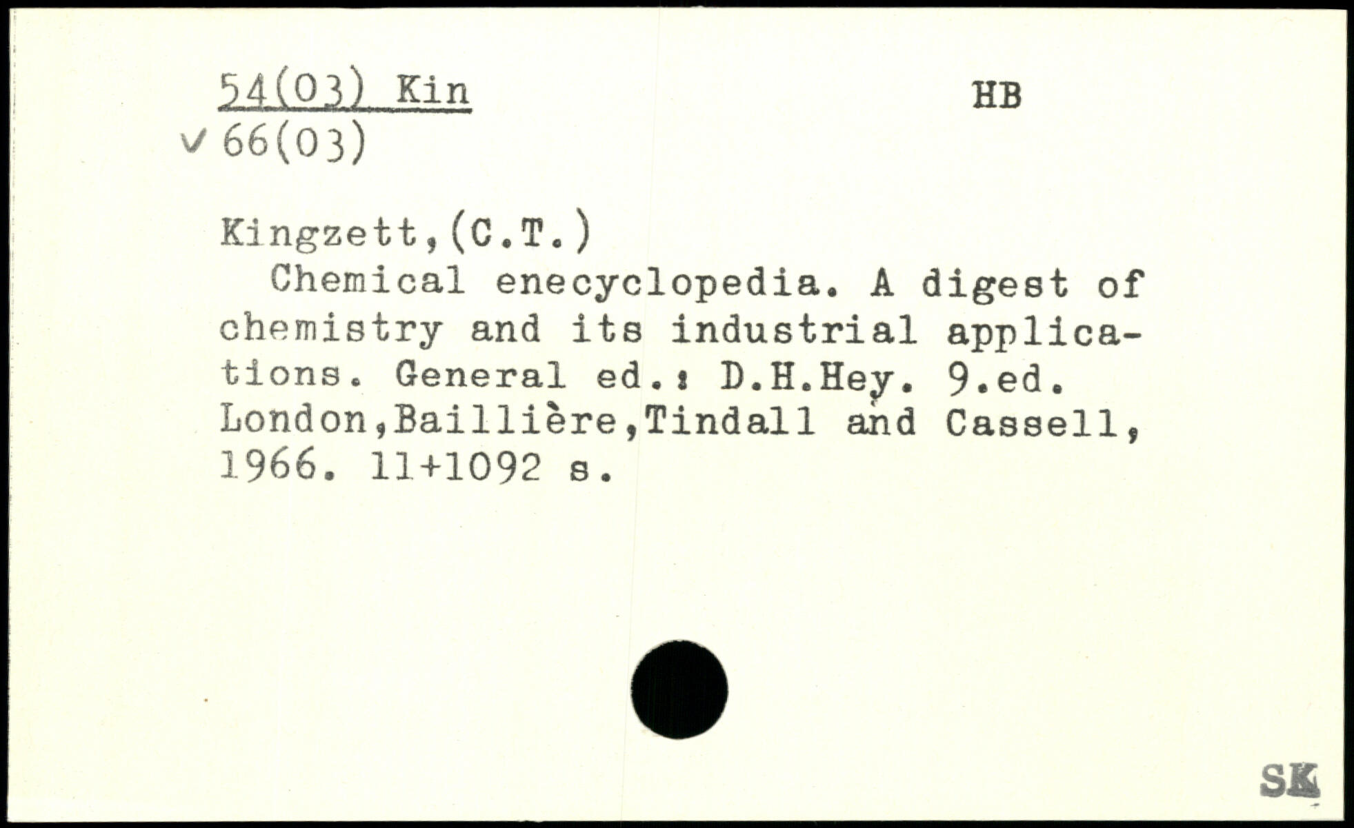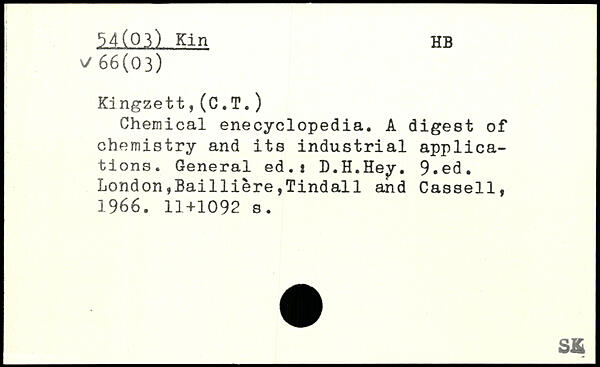Kd ngzett,(C.T.) Chemical enecyclopedia. A digest of chemistry and its industrial applications. General ed.t D.H.Hey.