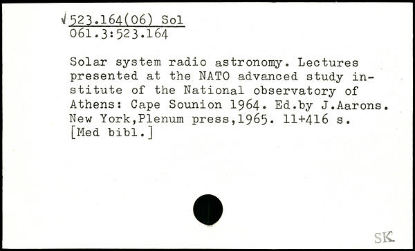 Solar system radio astronomy. Lectures presented at the NATO advanced study institute of the National observatory of Athens: Cape Sounion 1964. Ed.by J.Aarons.