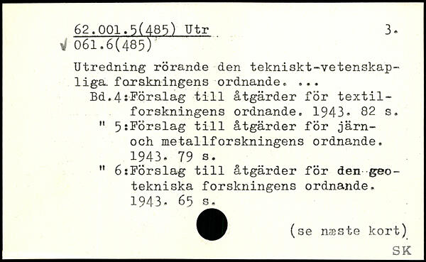 Utredning rörande den tekniskt-vetenskap-liga. forskningens ordnande. ...