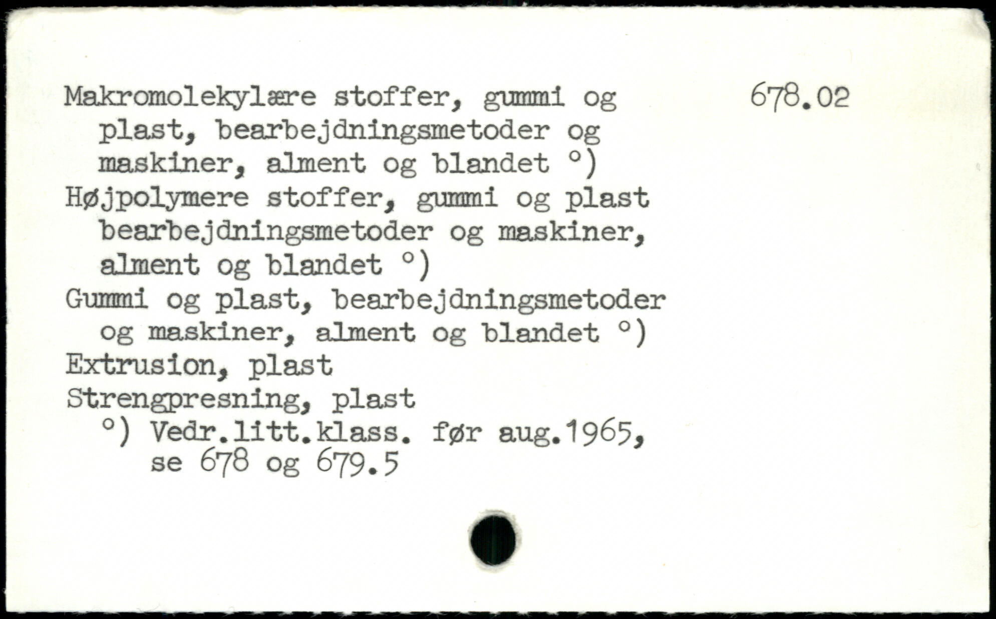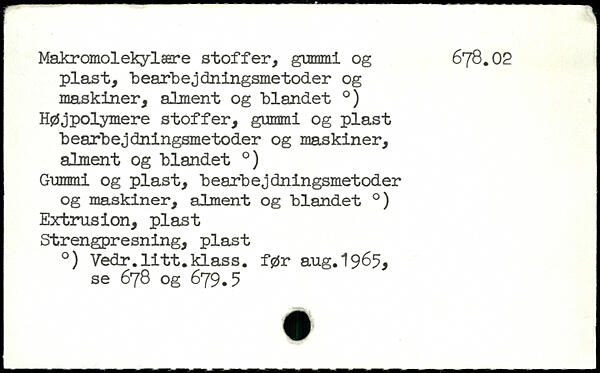 p ..II II Makromolekylære stoffer, gummi og 678.02 plast, 'bearbejdningsmetoder og maskiner, alment og blandet .) Højpolymere stoffer, gummi og plast bearbejdningsmetoder og maskiner, alment og blandet .) Gummi og plast, bearbejdningsmetoder og maskiner, alment og blandet .) Extrusion, plast Strengpresning, plast .) Vedr.litt.klass. før aug.1965. se 678 og 679.5