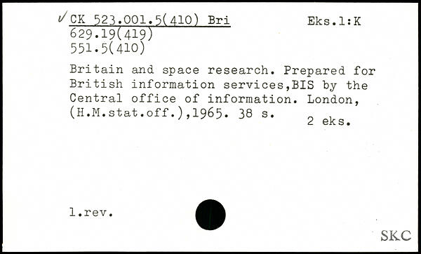 Britain and space research. Prepared for British information services,BIS by the Central office of information. London, (H.M.stat.off.),1965.