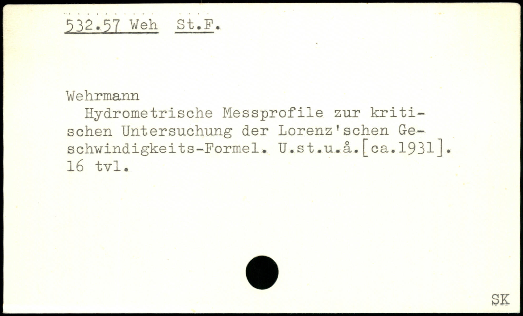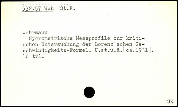 Hydrometrische Messprofile zur kritischen Untersuchung der Lorenz'sehen Geschwindigkeits-Formel. U.st.u.a.[ca.1931]. 16 tvl.