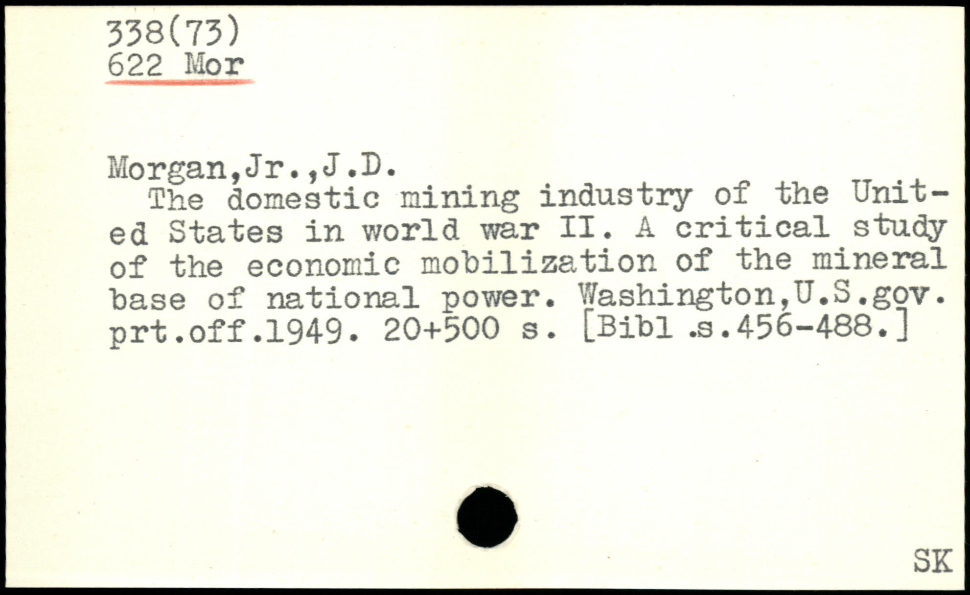 Morgan, Jr., J.3). The domestic mining industry of the United States in world war II. A critical^study of the economic mobilization of the mineral base of national power. Washington,U.S.gov. prt.off .1949.