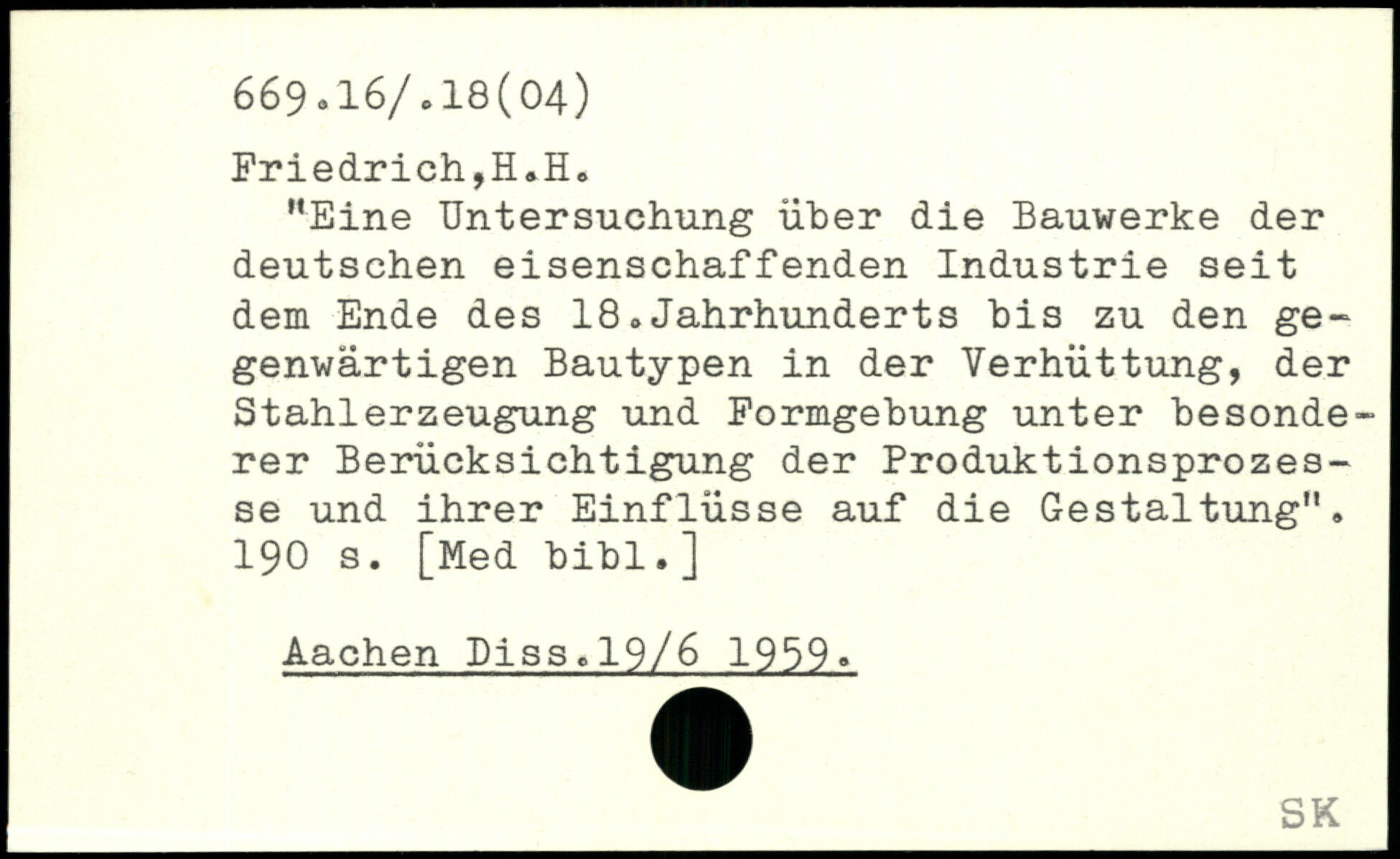 "Eine Untersuchung über die Bauwerke der deutschen eisenschaffenden Industrie seit dem Ende des 18,Jahrhunderts bis zu den gegenwärtigen Bautypen in der Verhüttung, der i Stahlerzeugung und Formgebung unter besonderer Berücksichtigung der Produktionsprozesse und ihrer Einflüsse auf die Gestaltung".