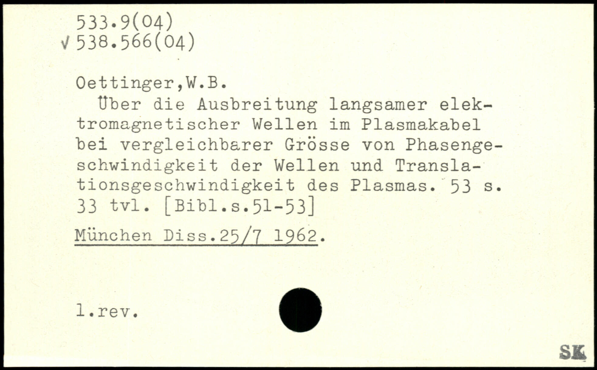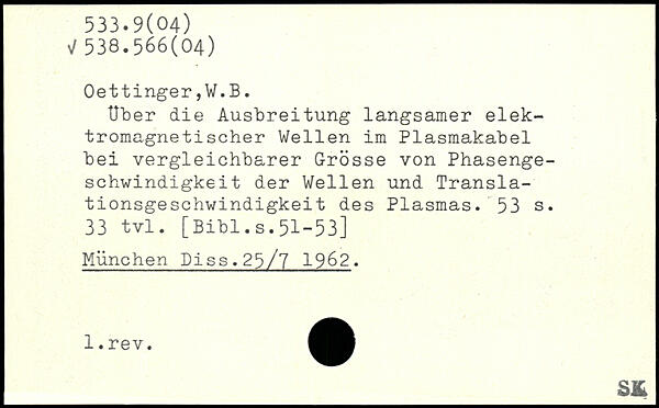 Uber die Ausbreitung langsamer elektromagnetischer Wellen im Plasmakabel bei vergleichbarer Grösse von Phasengeschwindigkeit der Wellen und Translationsgeschwindigkeit des Plasmas.