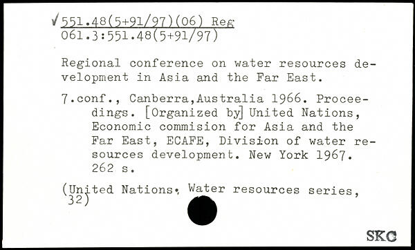 Regional conference on water resources development in Asia and the Far East. 7.conf., Canberra,Australia 1966. Proceedings. [Organized by] United Nations, Economic commision for Asia and the Far East, ECAFE, Division of water resources development.