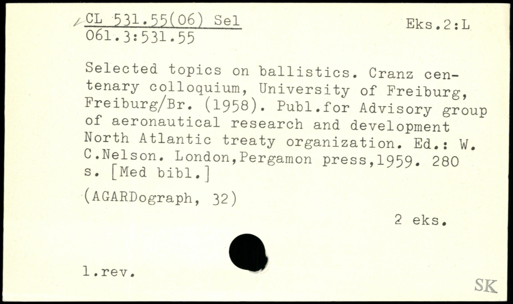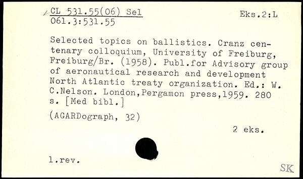 Selected topics on ballistics. Cranz centenary colloquium, University of Freiburg, Freiburg/Br. (1958). Publ.for Advisory group of aeronautical research and development North Atlantic treaty organization. Ed.: W. C.Nelson.
