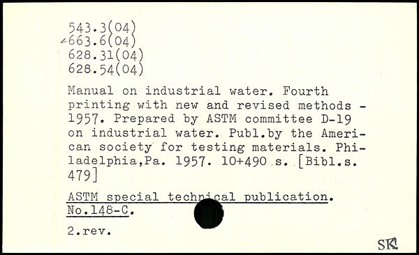 Manual on industrial water. Fourth printing with new and revised methods -1957. Prepared by ASTM committee D-19 on industrial water.