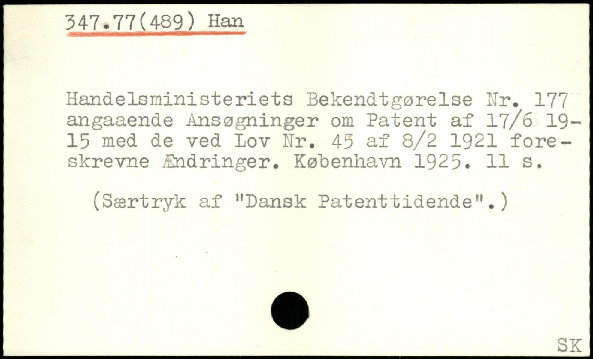 Handelsministeriets Bekendtgørelse Nr. 177 angaaende Ansøgninger om Patent af 17/6 19-15 med de ved Lov Nr. 45 af 8/2 1921 foreskrevne Ændringer.
