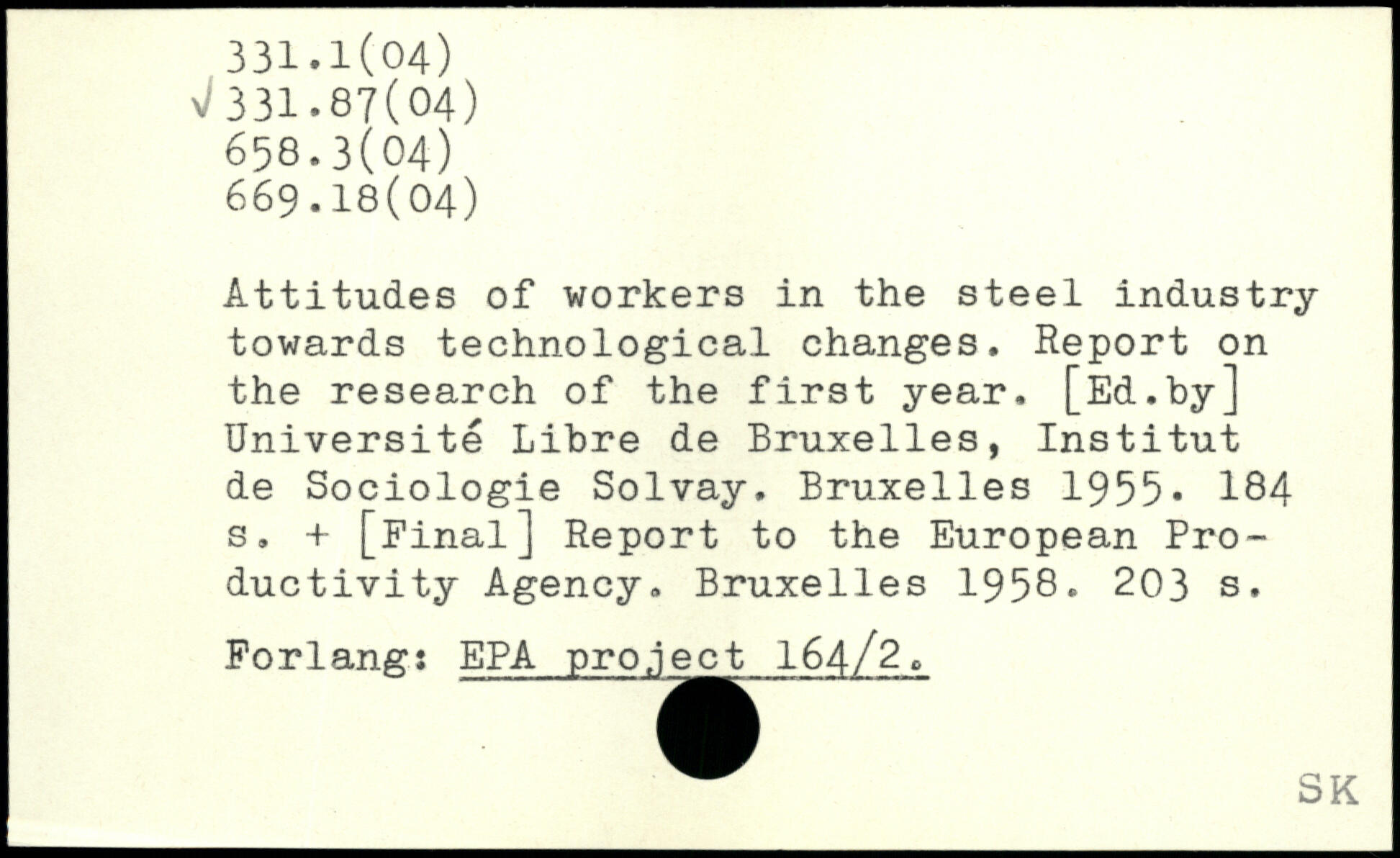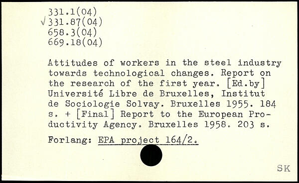 Attitudes of workers in the steel industry towards technological changes. Report on the research of the first year, [Ed.by] Université Libre de Bruxelles, Institut de Sociologie Solvay.