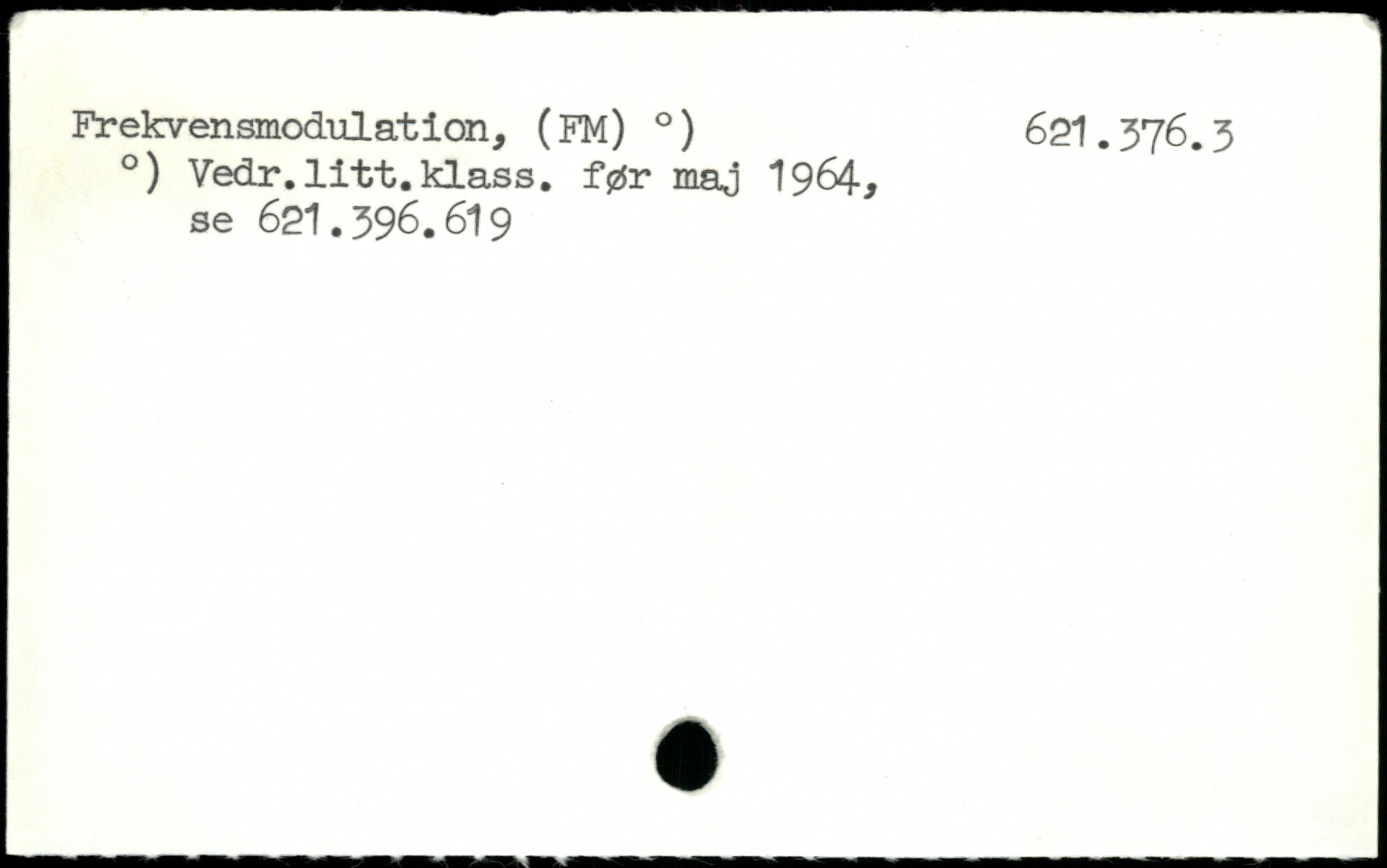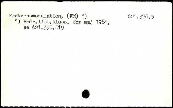 Frekvensmodulation, ( FM). ) 621.376.3 .) Vedr.litt.klass, før maj 1964. se 621.396.619