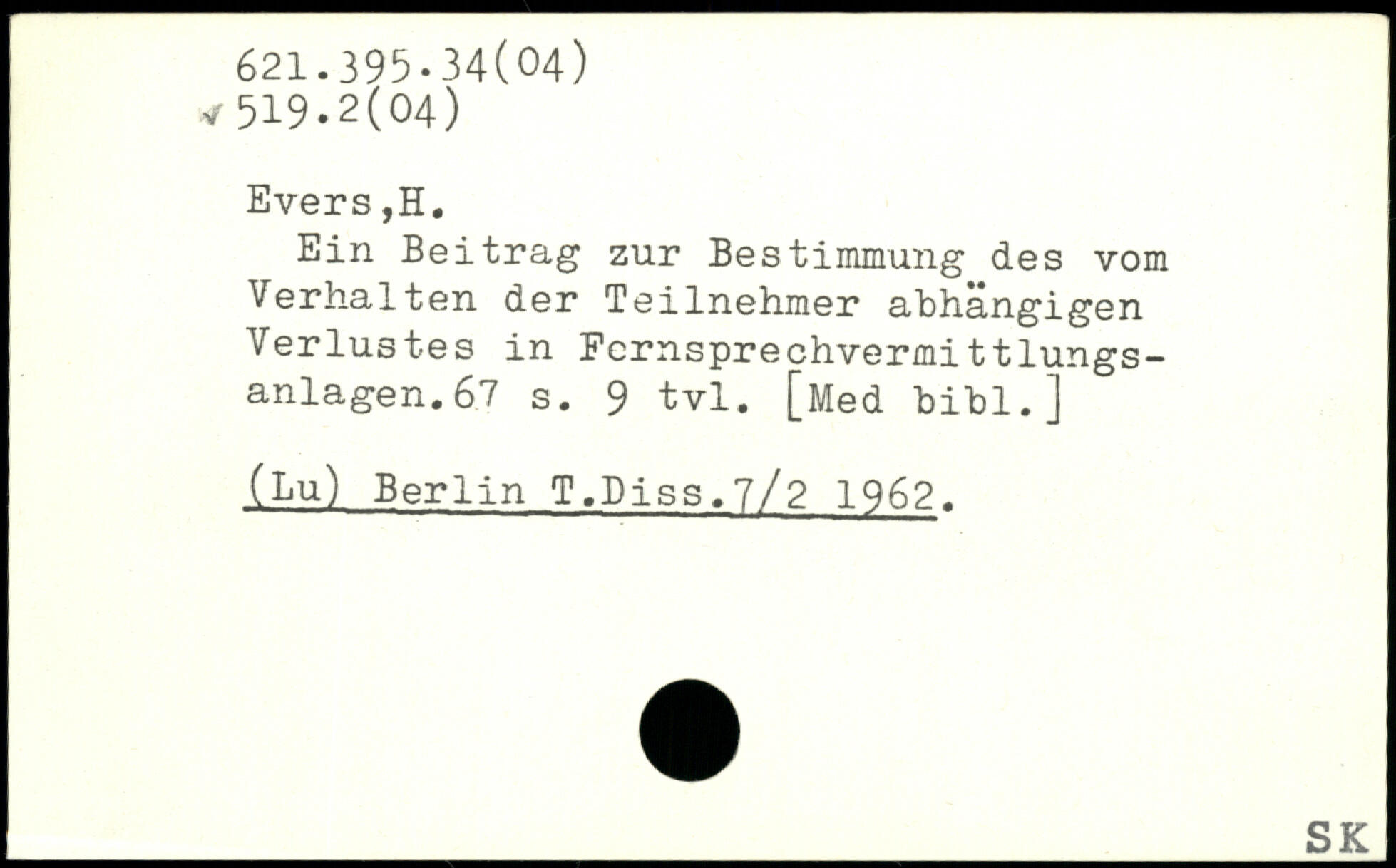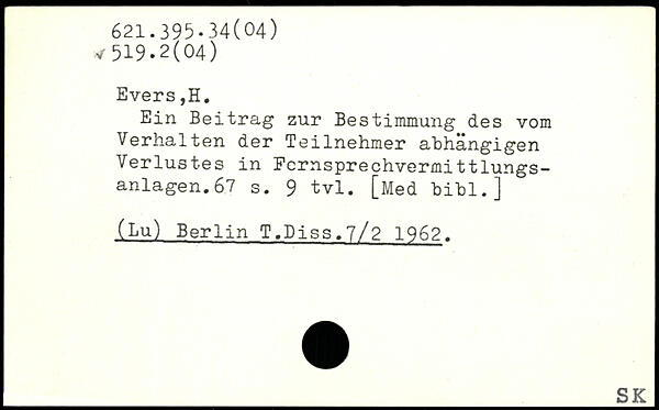 Ein Beitrag zur Bestimmung des vom Verhalten der Teilnehmer abhängigen Verlustes in Pcrnsprechvermittlungs-anlagen.