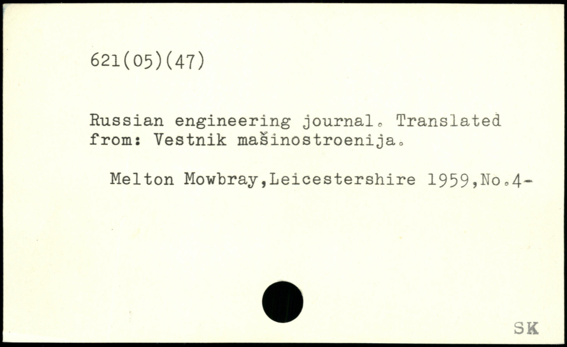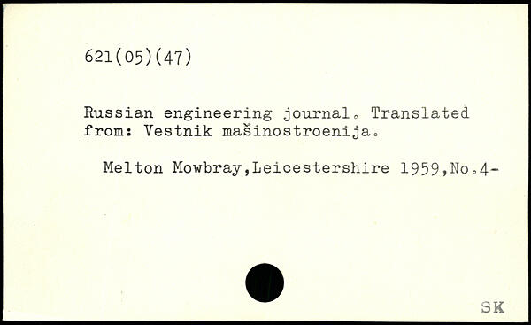 Russian engineering journal. Translated from: Yestnik masinostroenija0 Melton Mowbray Leicestershire 1959>No.4-