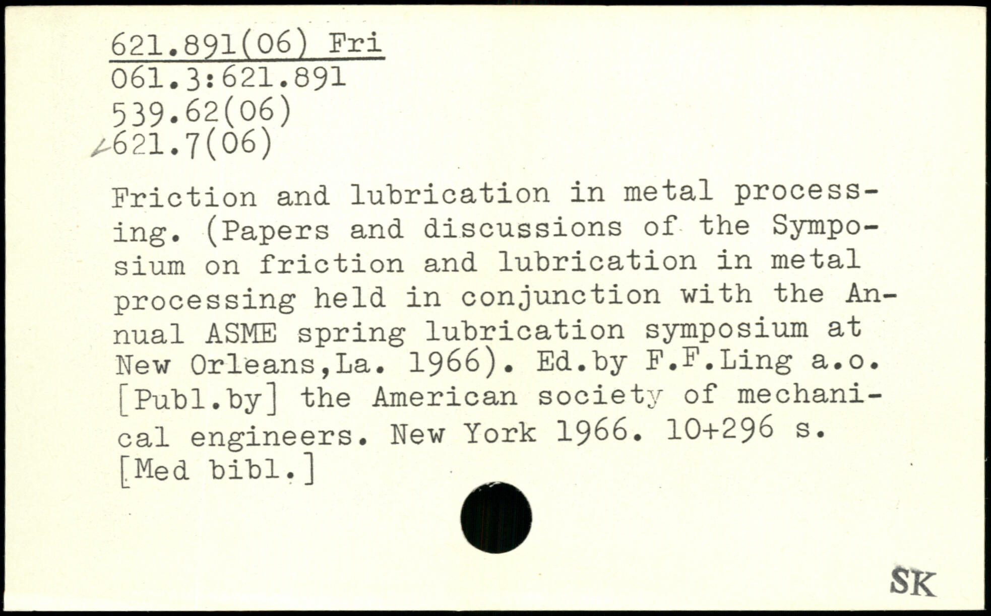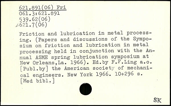 Friction, and lubrication in metal processing. (Papers and discussions of the Symposium on friction and lubrication in metal processing held in conjunction with the Annual ASME spring lubrication symposium at New Orleans,La. 1966). Ed.by F.F.Ling a.o.