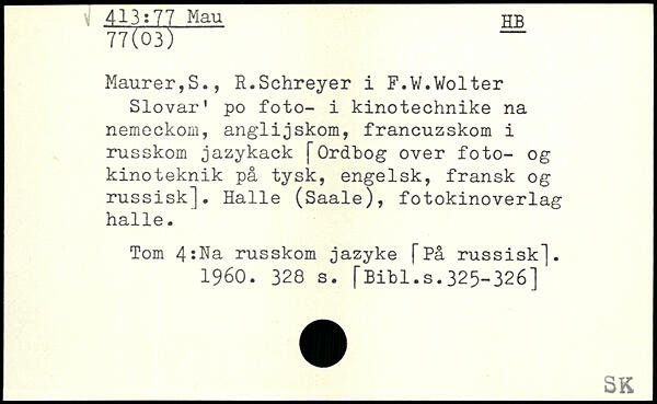 Maurer,S., R.Schreyer i F.V.Volter Slovar. po foto- i kinotechnike na nemeckom, anglijskom, francuzskom i russkom jazykack [Ordbog over foto- og kinoteknik på tysk, engelsk, fransk og russisk]. Halle (Saale), fotokinoverlag halle. Tom 4:Ra russkom jazyke [På russisk]. 1960.