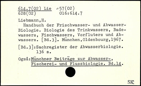 Handbuch der Frischwasser- und Abwasser-Biologie. Biologie des Trinkwassers, Badewassers, Fischwassers, Vorfluters und Abwassers.