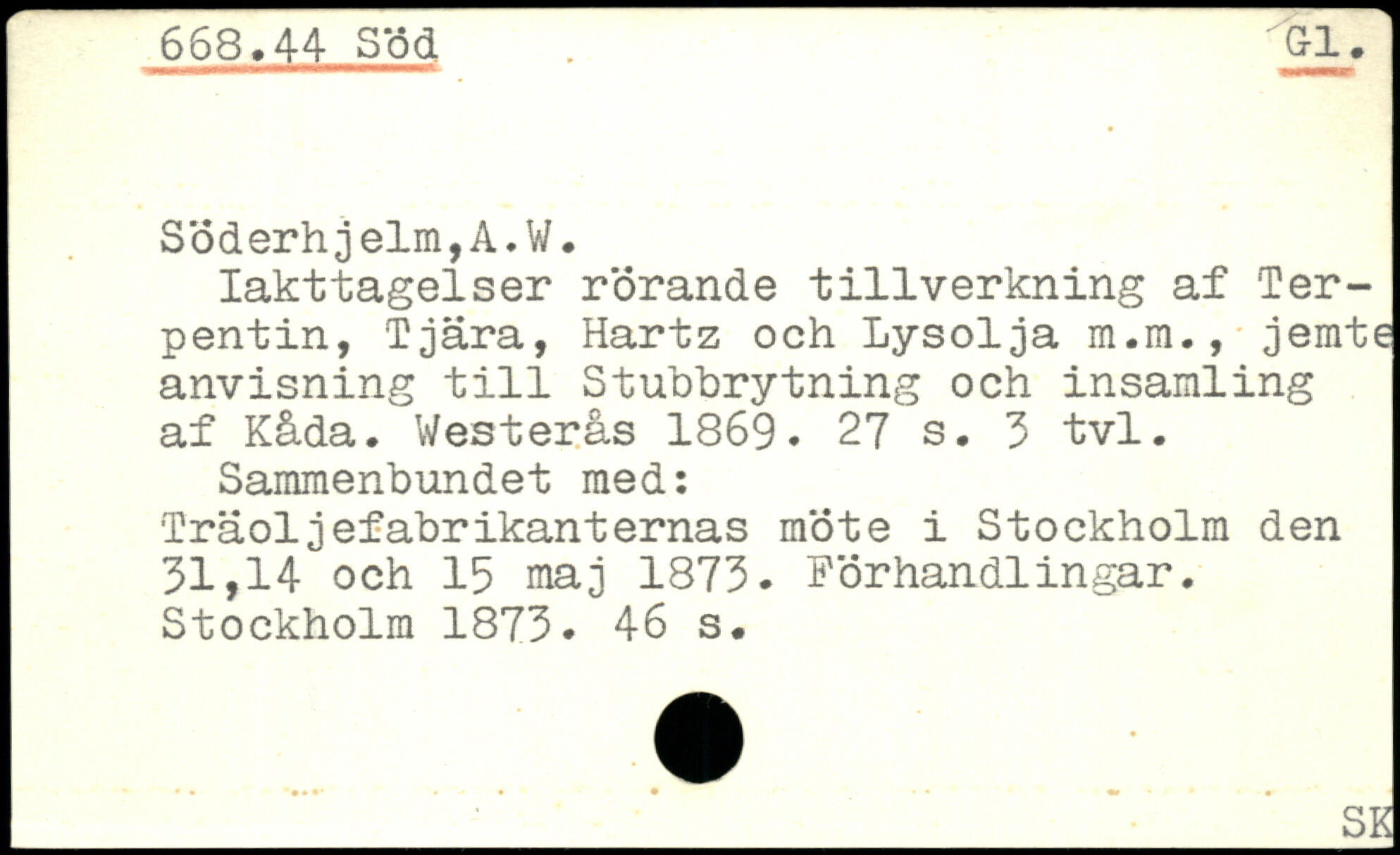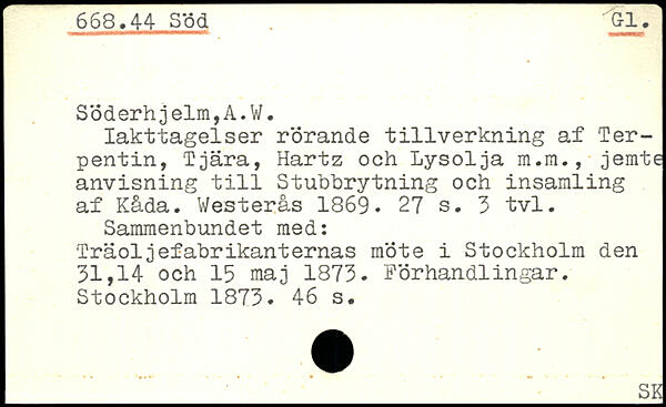Iakttagelser r'örande tillverkning af Terpentin, Tjära, Hartz och Lysolja m.m., jemte anvisning till Stuhhrytning och insamling af Kåda. Westerås 1869.