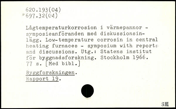 Lågtemperaturkorrosion i värmepannor -svmposieanföranden med diskussionsinlägg. Low-temperature corrosin in central heating furnaces - symposium with reports, and discussions. Utg.: Statens institut för byggnadsforskning.