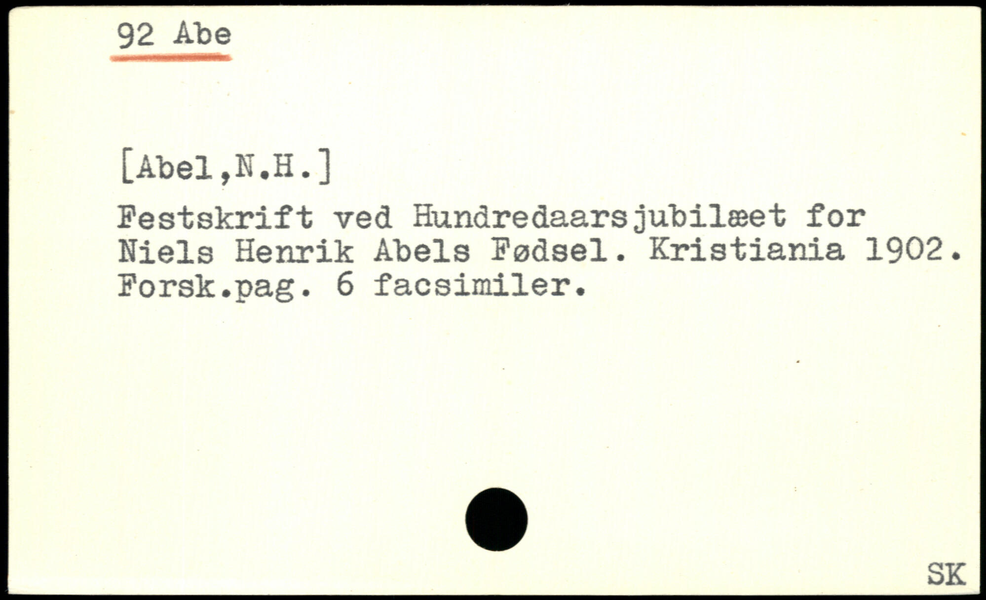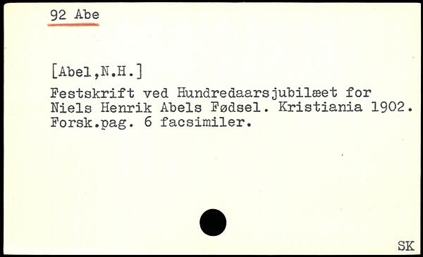 Pestskrift ved Hundredaarsjubilæet for Niels Henrik Abels Pødsel. Kristiania 1902. Porsk.pag. 6 facsimiler.