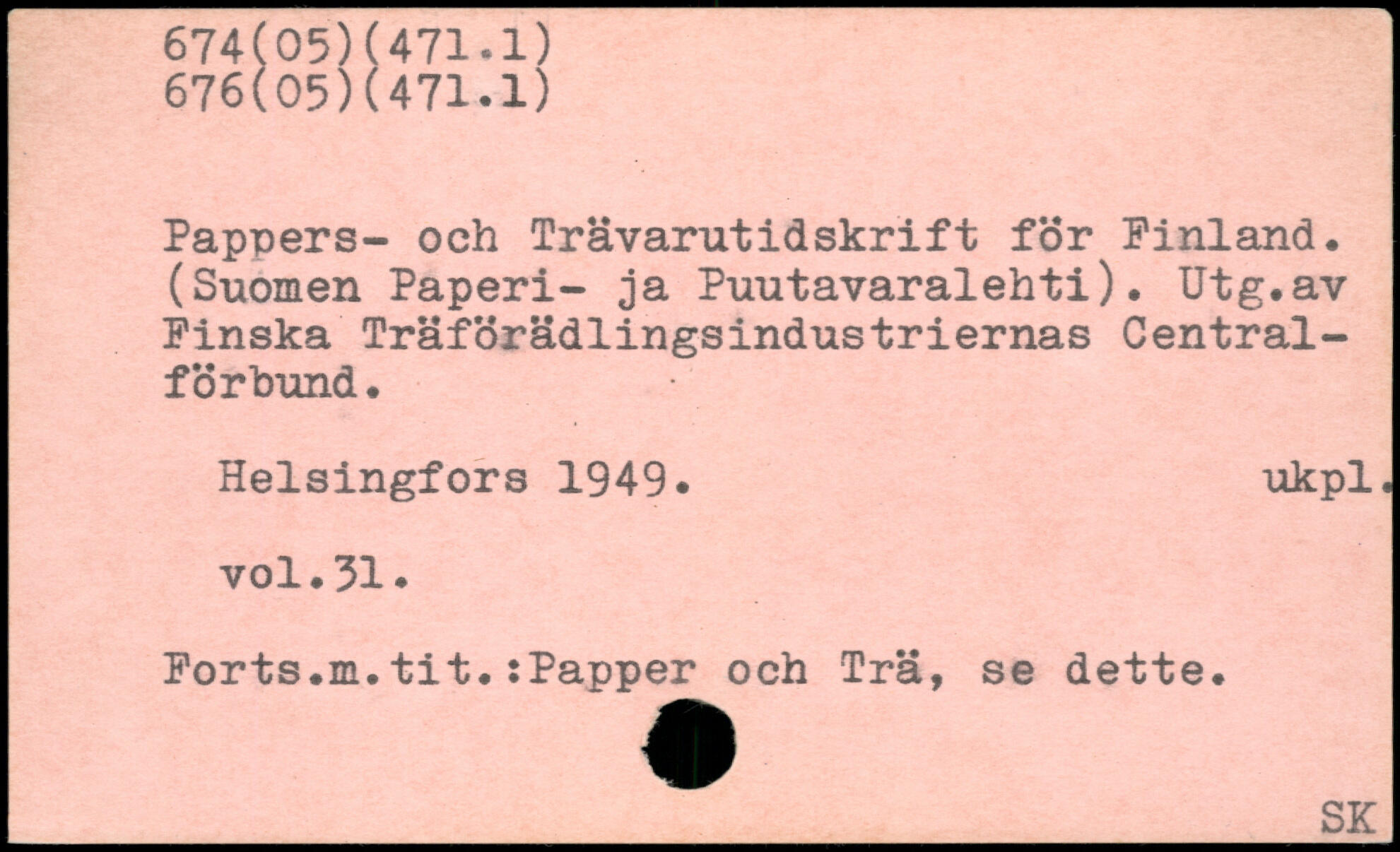 Pappers- och Trävarutidskrift för Pinland. (Suomen Paperi- ja Puutavaralehti). Utg.av Finska Träförädlingsindustriernas Centralförbund.