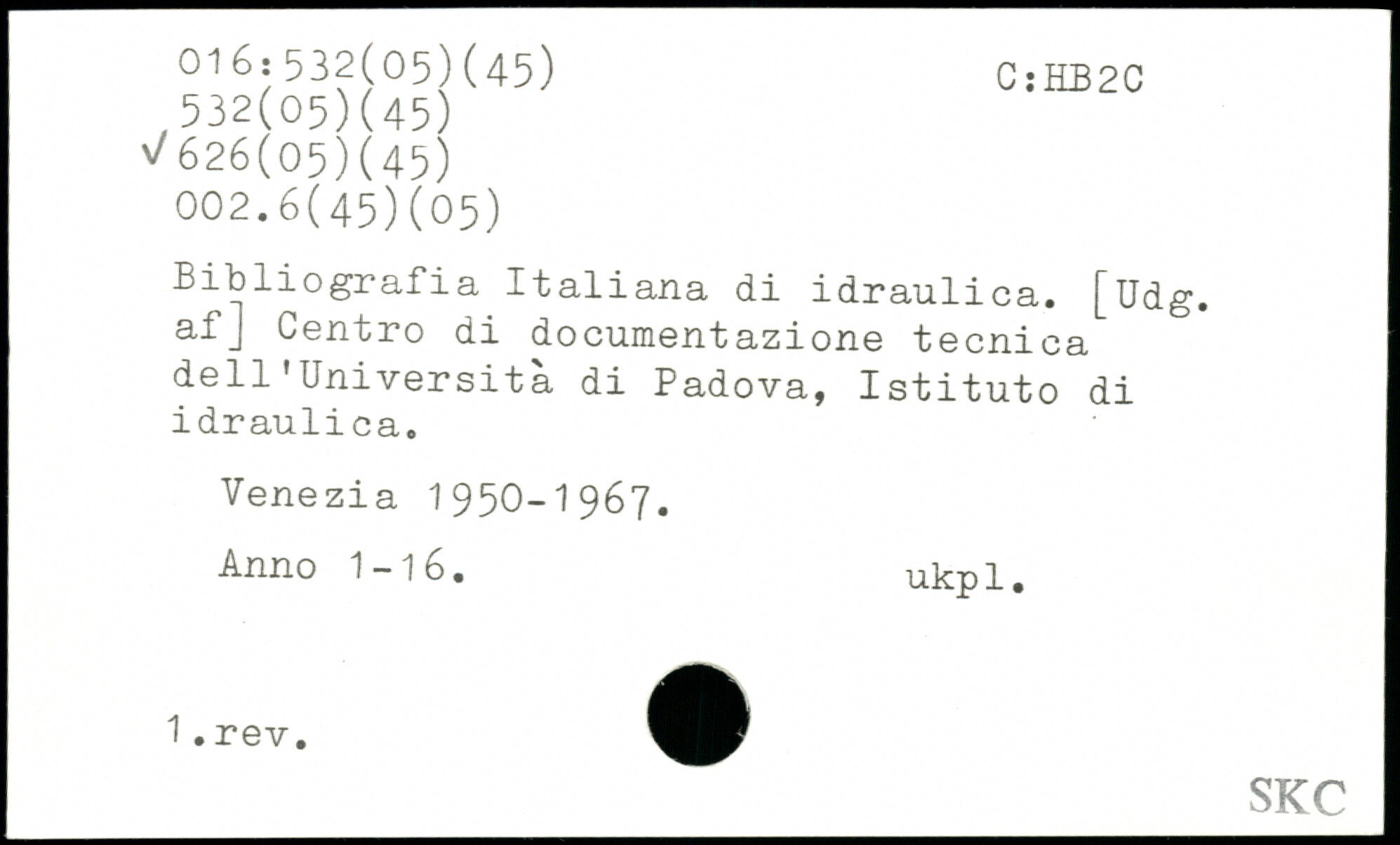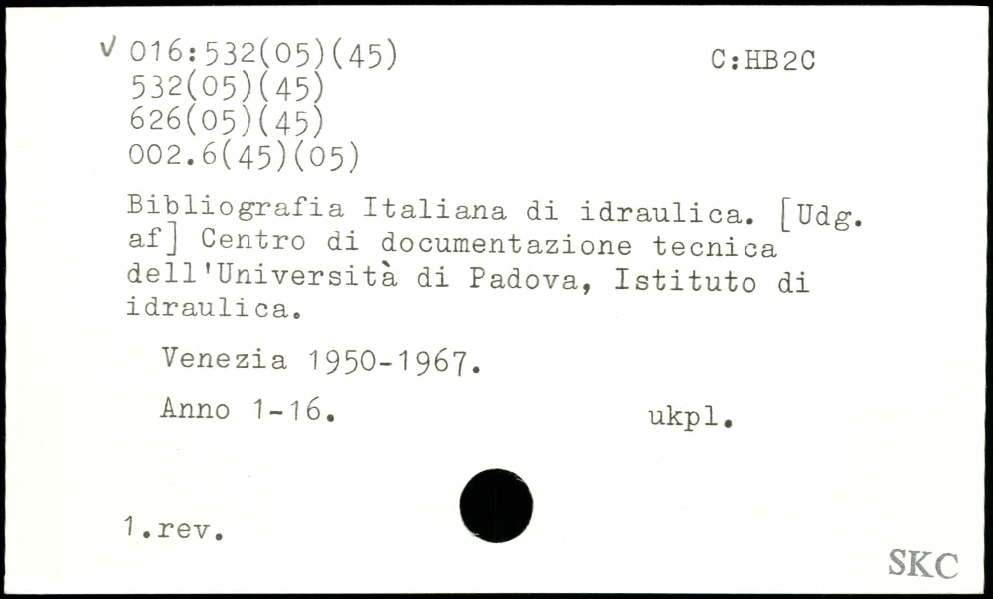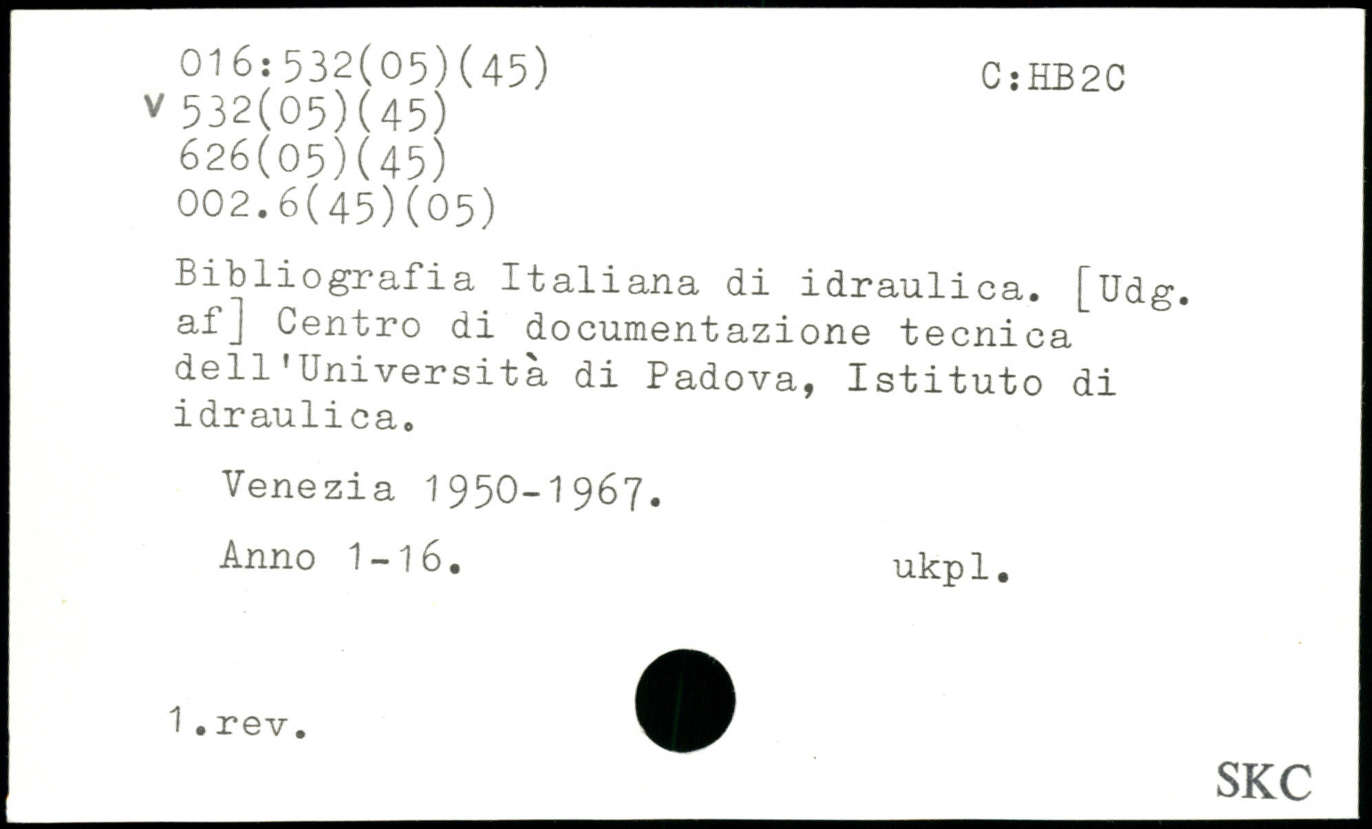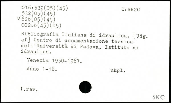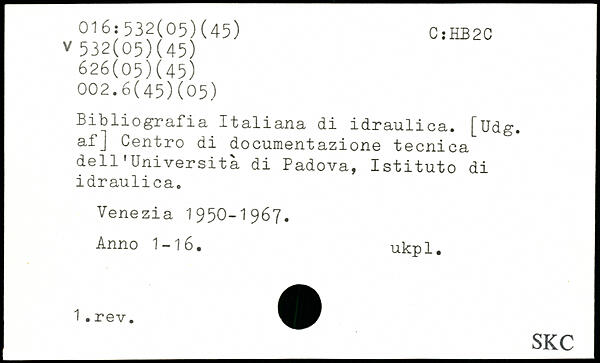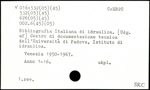 Bibliografia Italiana di idraulica. [Udg. afj Centro di documentazione tecnica dell’Universita di Padova, Istituto di idraulica. Venezia 1950-1967. Anno 1-16. ukpi. ;