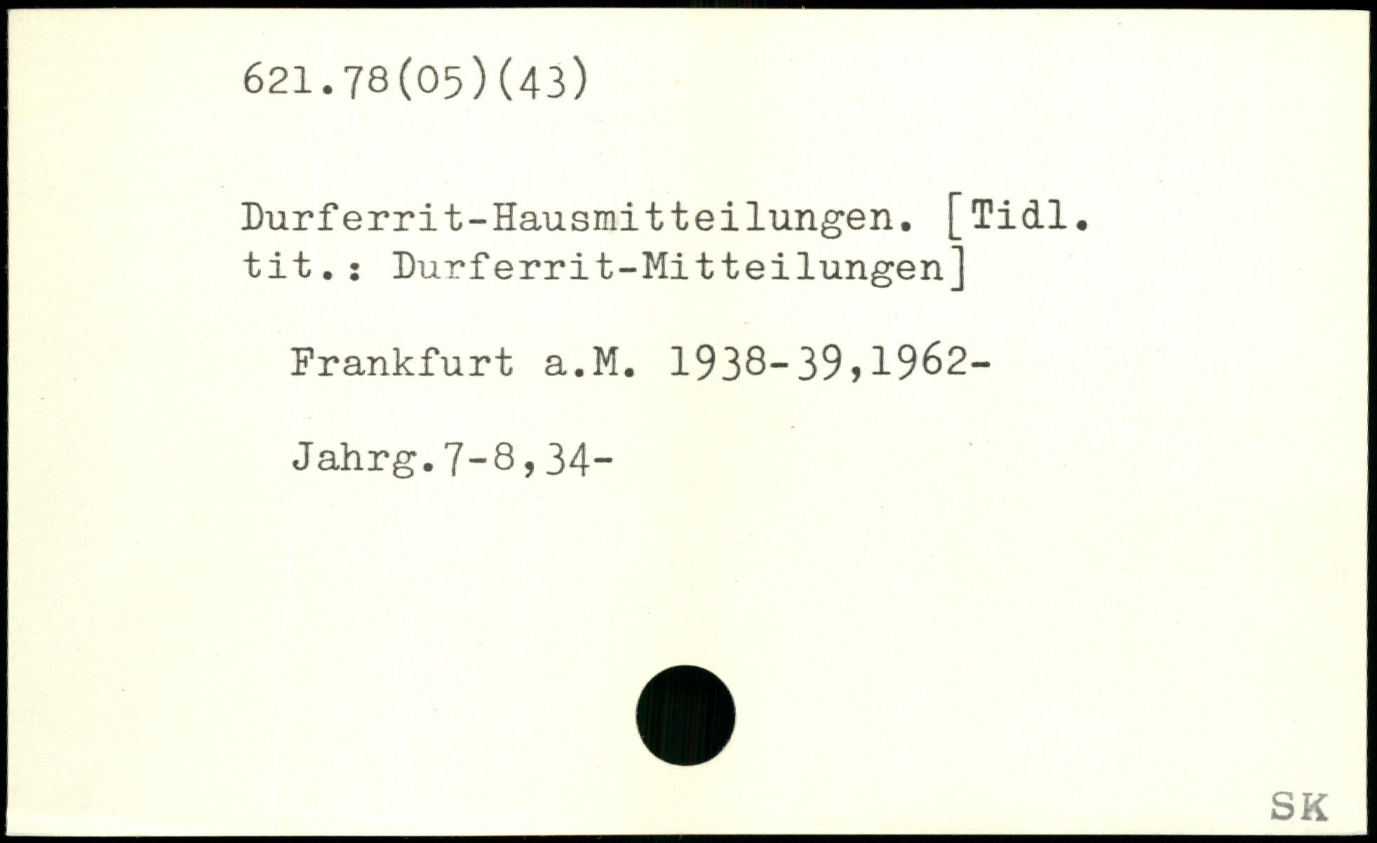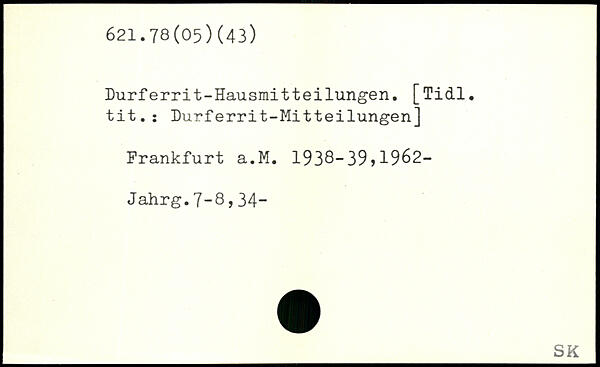Durferrit-Hausmitteilungen. [Tidl. tit.: Durferrit-Mitteilungen] Frankfurt a.M. 1938-39>1962- Jahrg.7-8,34-
