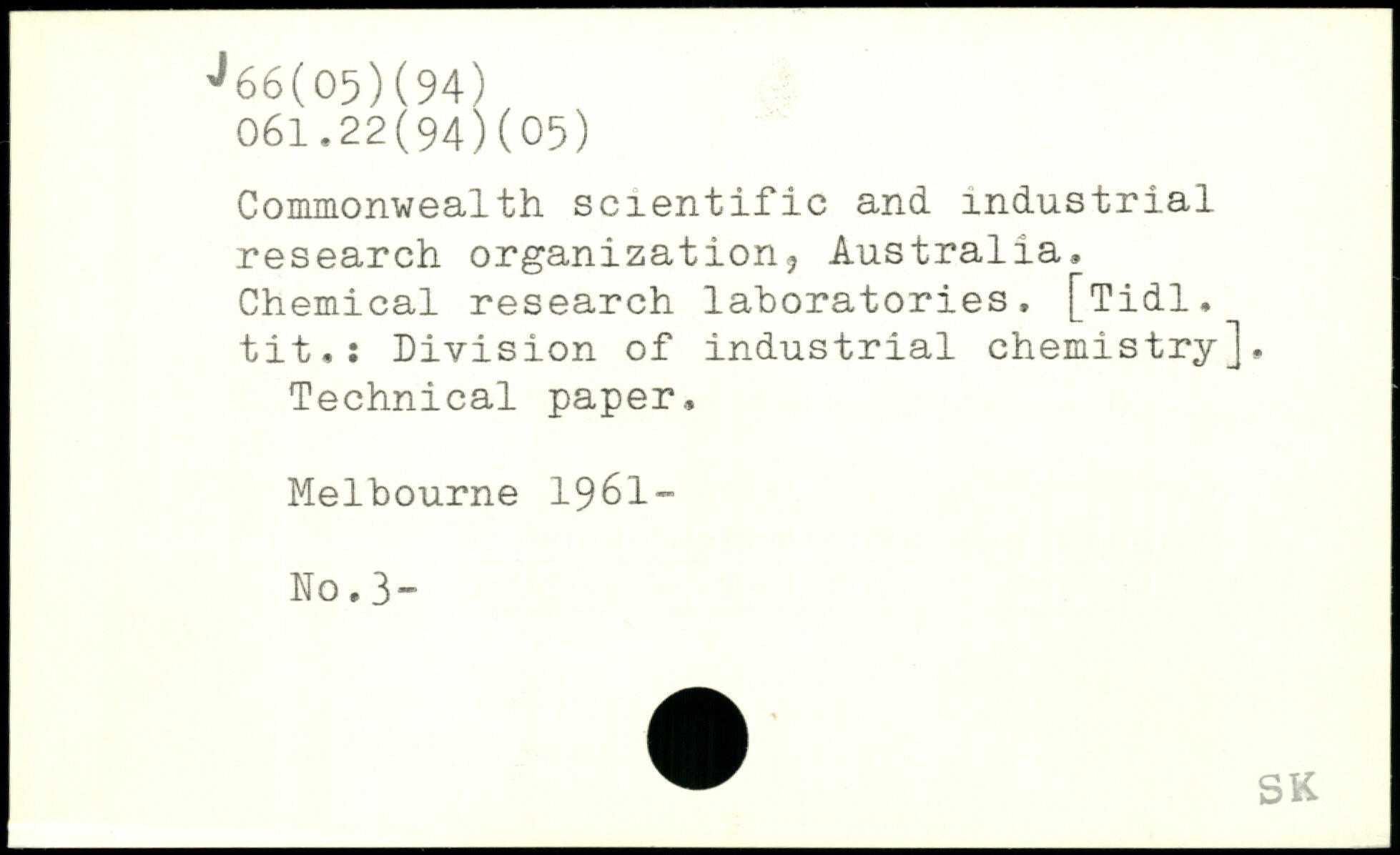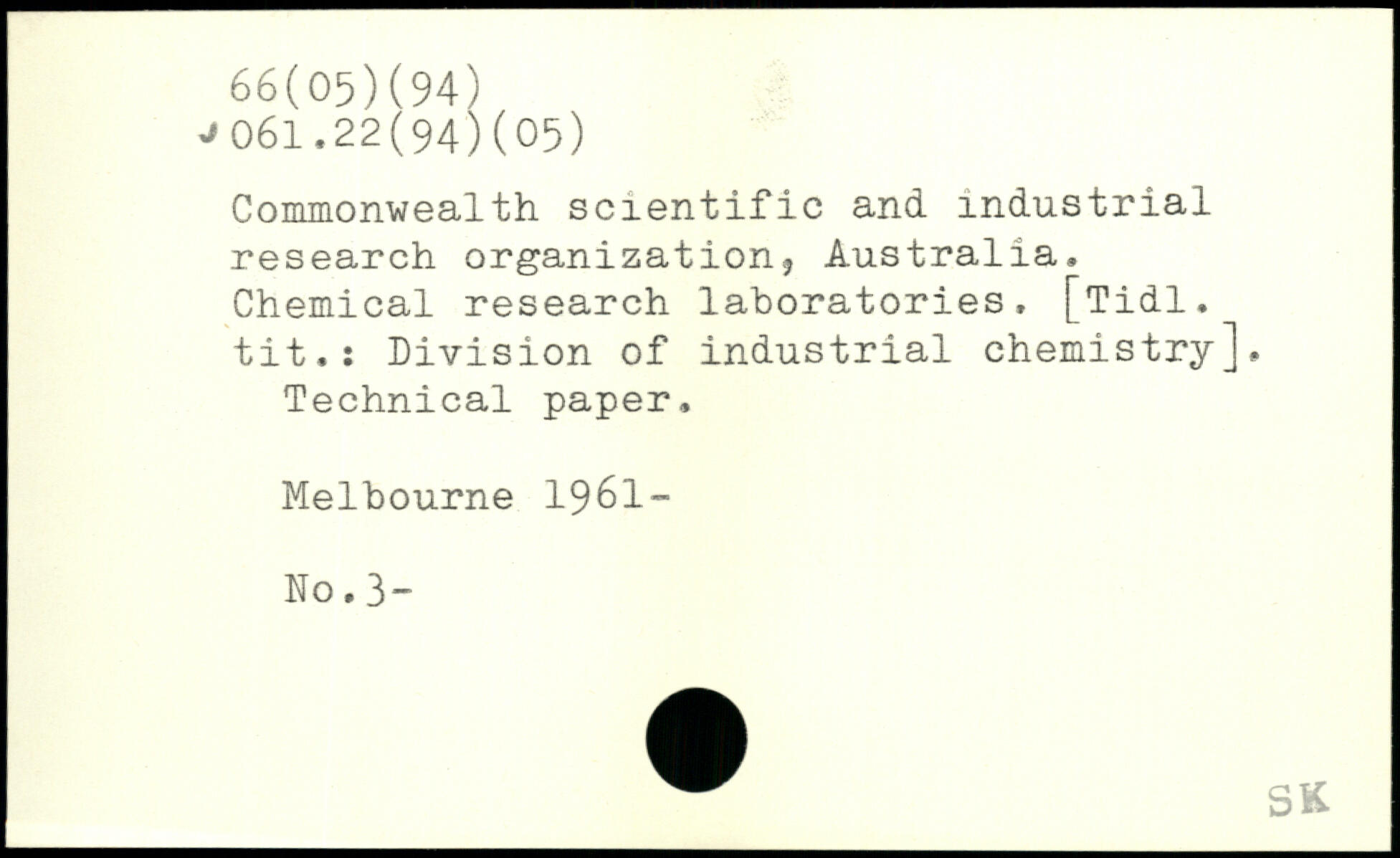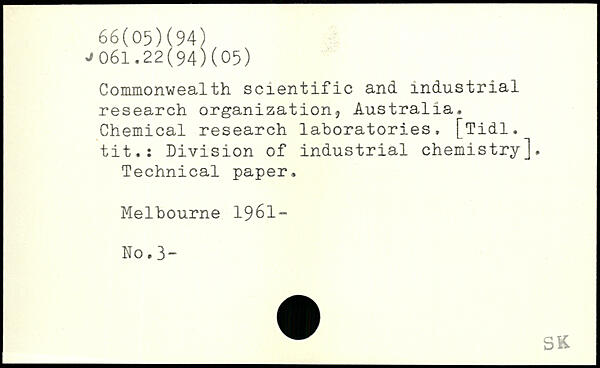 Commonwealth scientific and industrial research organization, Australia, Chemical research laboratories. [Tidl. tit,: Division of industrial chemistry], Technical paper., Melbourne 1961- No. 3“