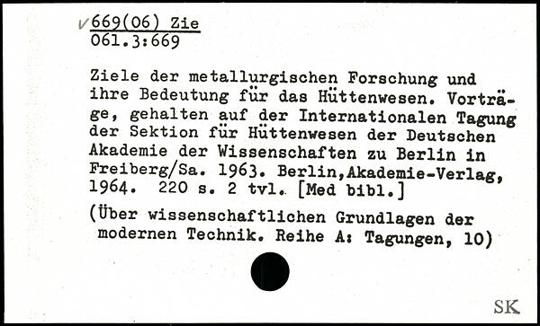 Ziele der metallurgischen Forschung und ihre Bedeutung für das Hüttenwesen. Vorträge, gehalten auf der Internationalen Tagung der Sektion für Hüttenwesen der Deutschen Akademie der Wissenschaften zu Berlin in Freiberg/Sa. 1963. Berlin,Akademie-Verlag. 1964.