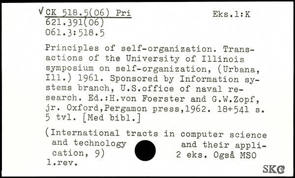 Principles of self-organization. Transactions of the University of 1111nois symposium on self-organization, (Urbana, 111.) 1961. Sponsored by Information systems branch, U.S.office of naval research. Ed.:H.von Foerster and G.W.Zopf, jr.