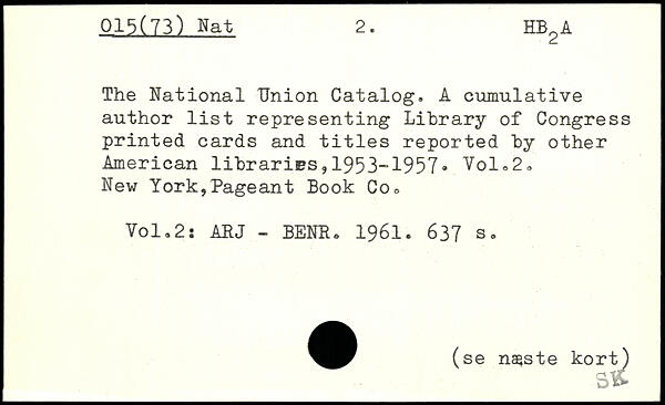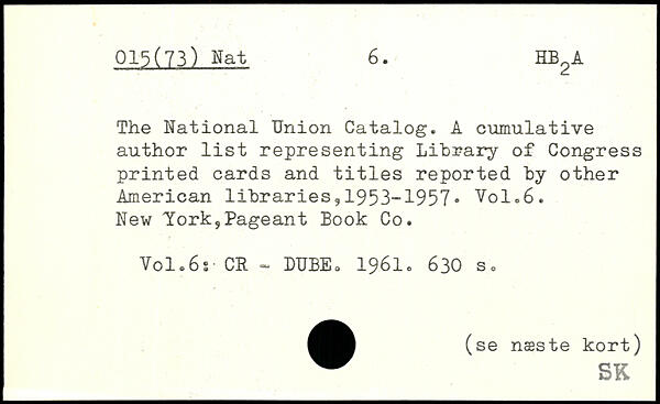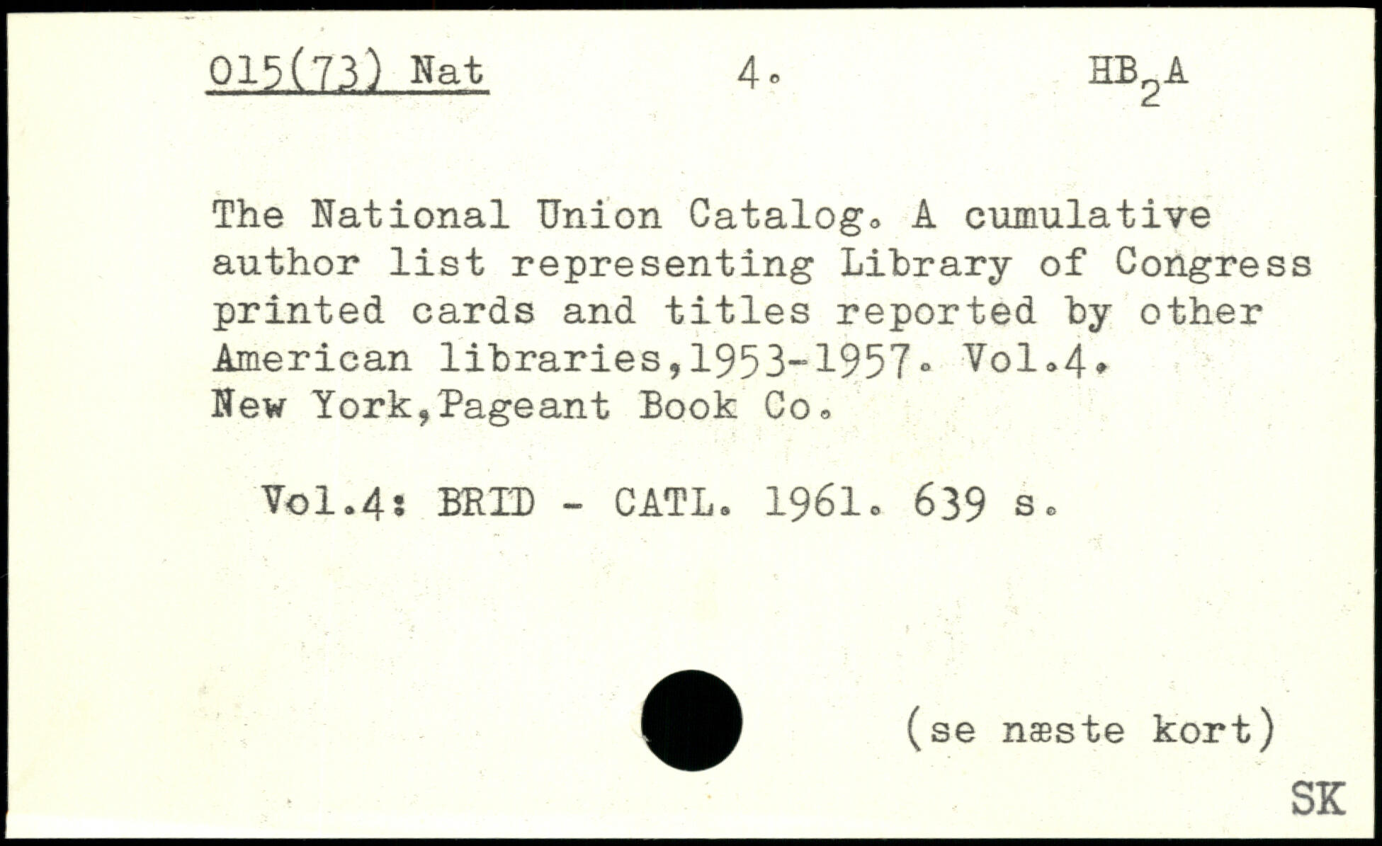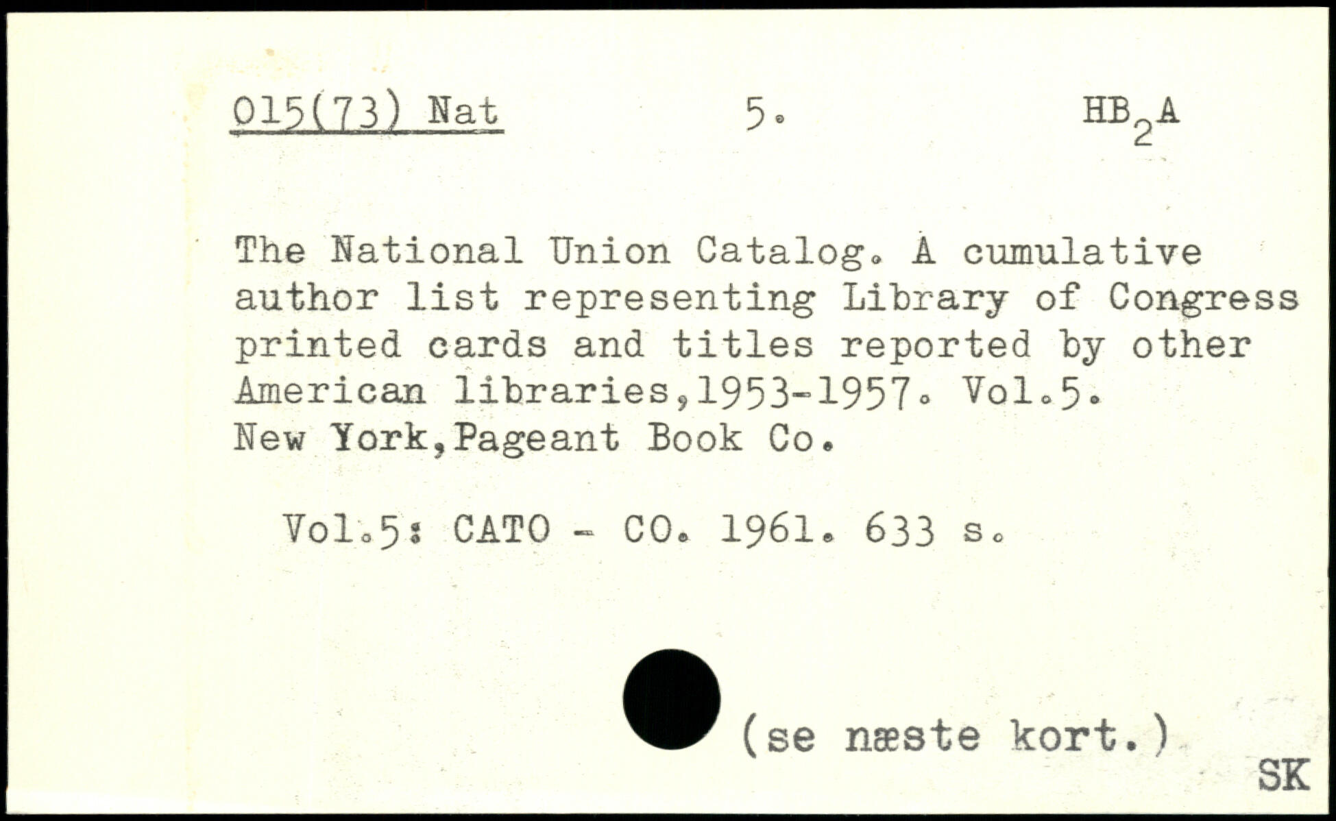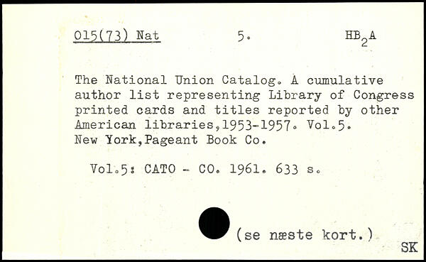 The National Union Catalog, A cumulative author list representing Library of Congress printed cards and titles reported by other American libraries. 1953-1957. Vol,5. New York,Pageant Book Co. Vol,5: CATO - CO. 1961.