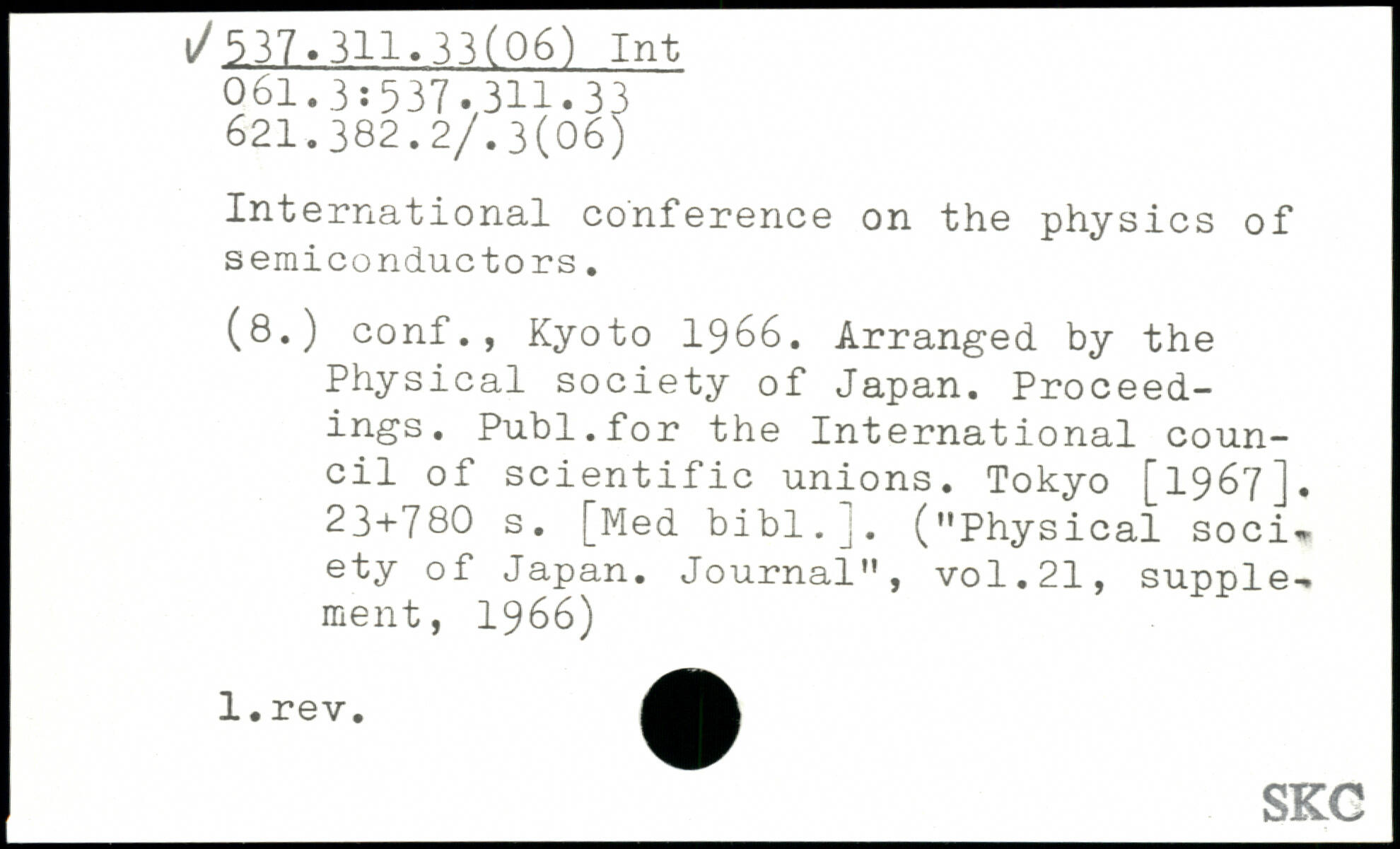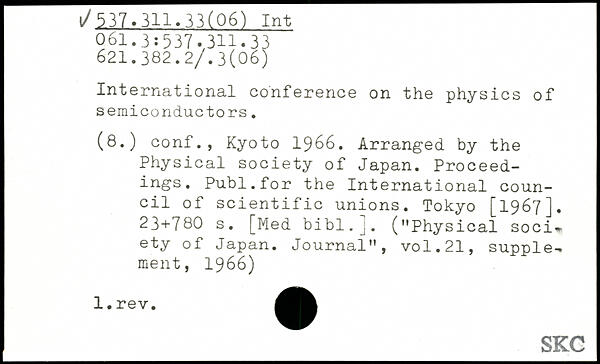 International conference on the physics of semiconductors. (8.) conf., Kyoto 1966. Arranged by the Physical society of Japan. Proceedings. Publ.for the International council of scientific unions.