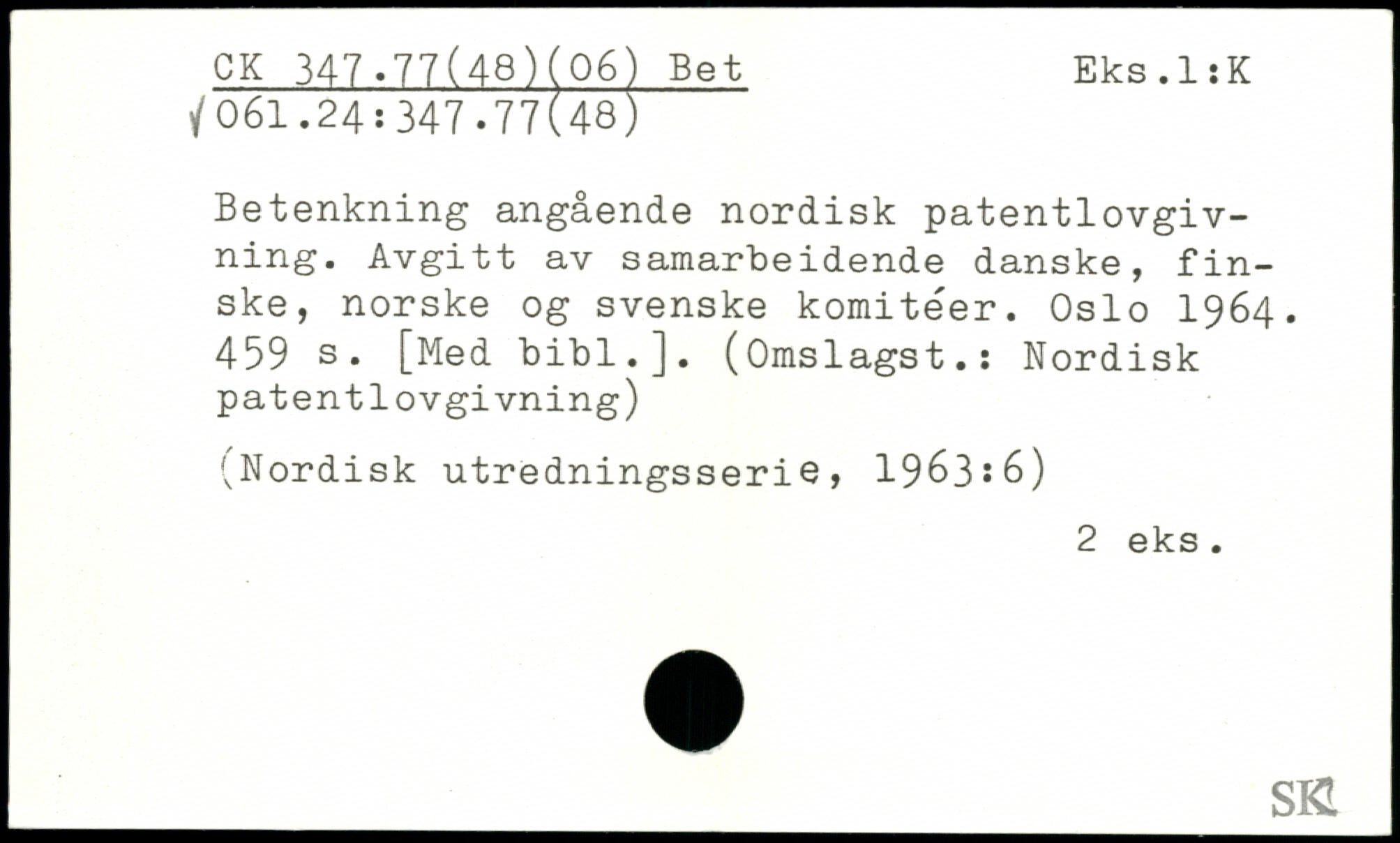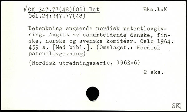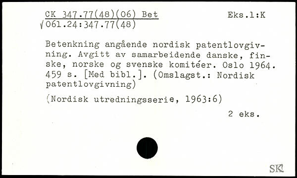 Betenkning angående nordisk patentlovgivning. Avgitt av samarbeidende danske, finske, norske og svenske komiteer. Oslo 1964.