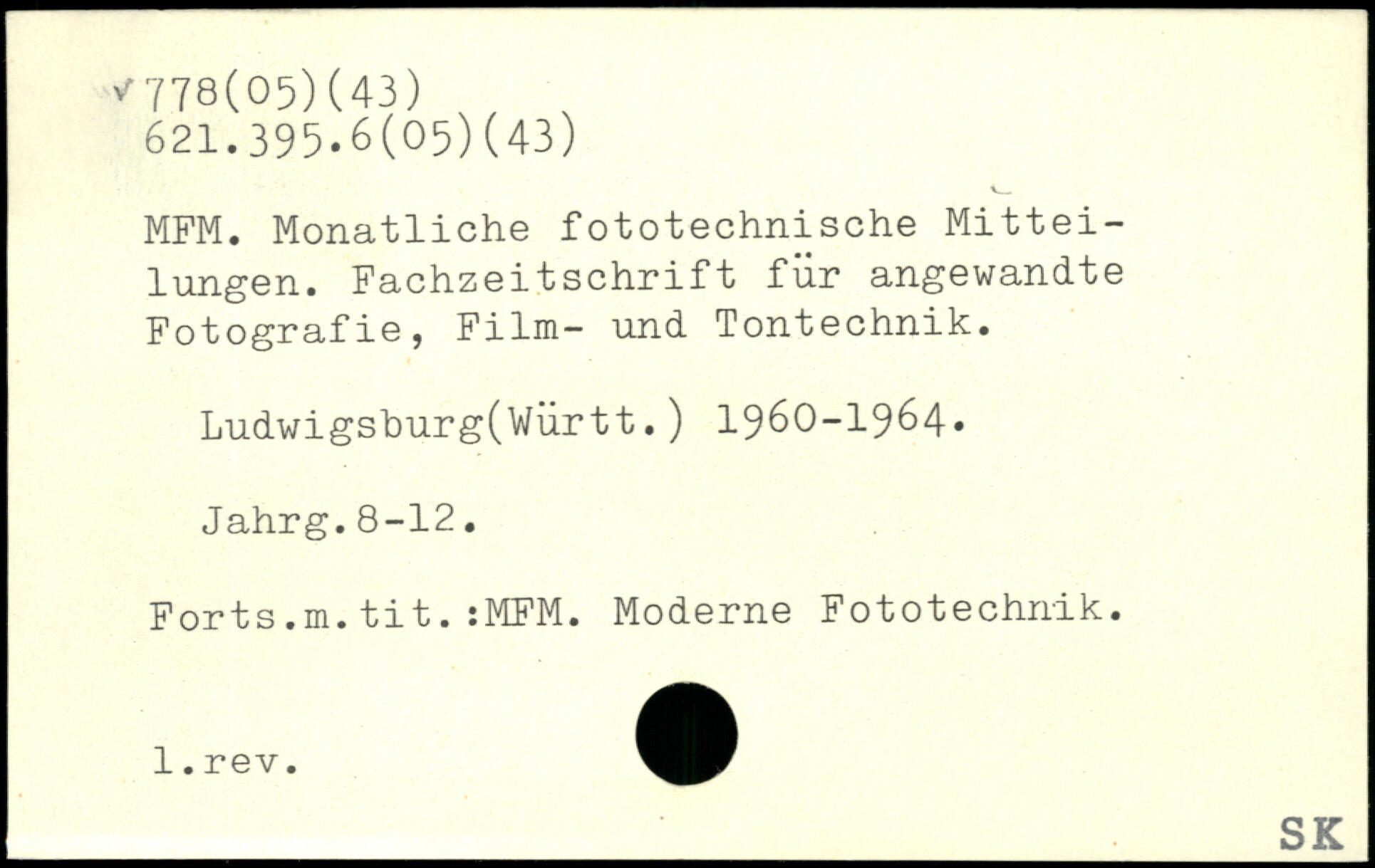 MFM. Monatliche fototechnische Mitteilungen. Fachzeitschrift für angewandte Fotografie, Film- und Tontechnik. Ludwigsburg(Württ.) 1960-1964. Jahrg.8-12. Forts.m.tit.:MFM. Moderne Fototechnik, l.rev.