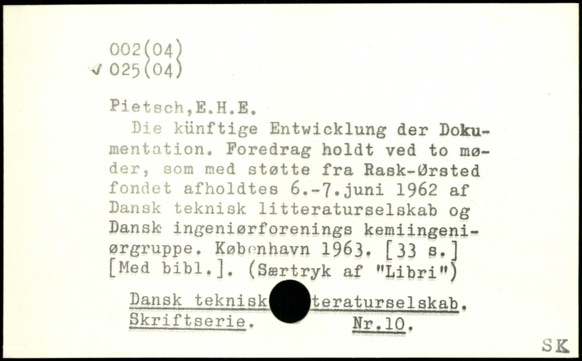 Die künftige Entwicklung der Dokumentation. Foredrag holdt ved to møder, som med støtte fra Rask-Ørsted fondet afholdtes 6.-7.juni 1962 af Dansk teknisk litteraturselskab og Dansk ingeniørforenings kemiingeniørgruppe.