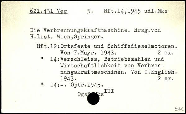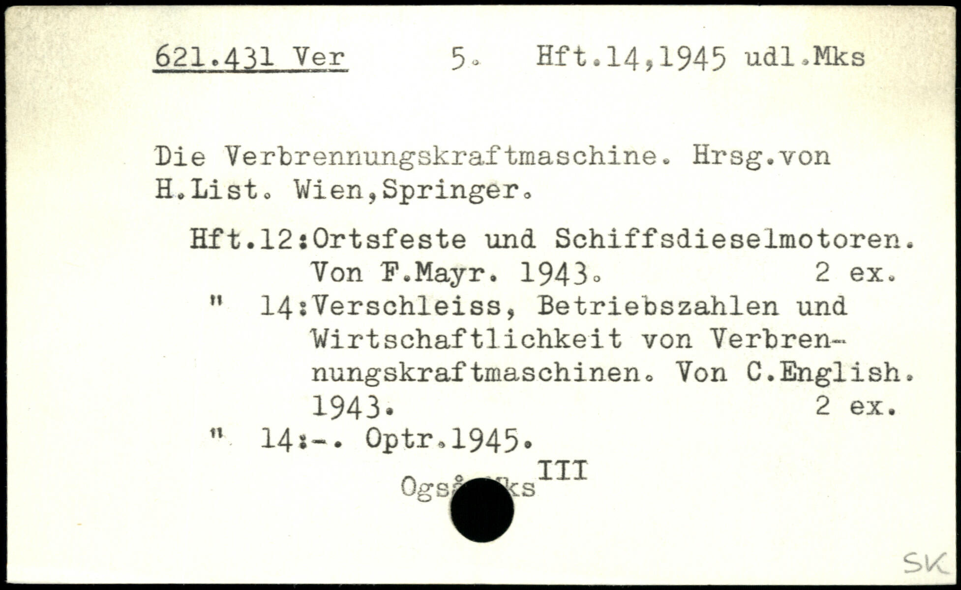 Die Verbrennungskraftmaschine. Hrsg.von H.List. Vien,Springer, Hft.12sOrtsfeste und Schiffsdieselmotoren. Von E.Mayr. 1943, 2 ex. ” 14:Verschleiss, Betriebszahlen und Wirtschaftlichkeit von Verbrennungskraf tmaschinen, Von C.English. 1943, 2 ex. n 14.-. Optr.1945. III Ogs|Jp:s