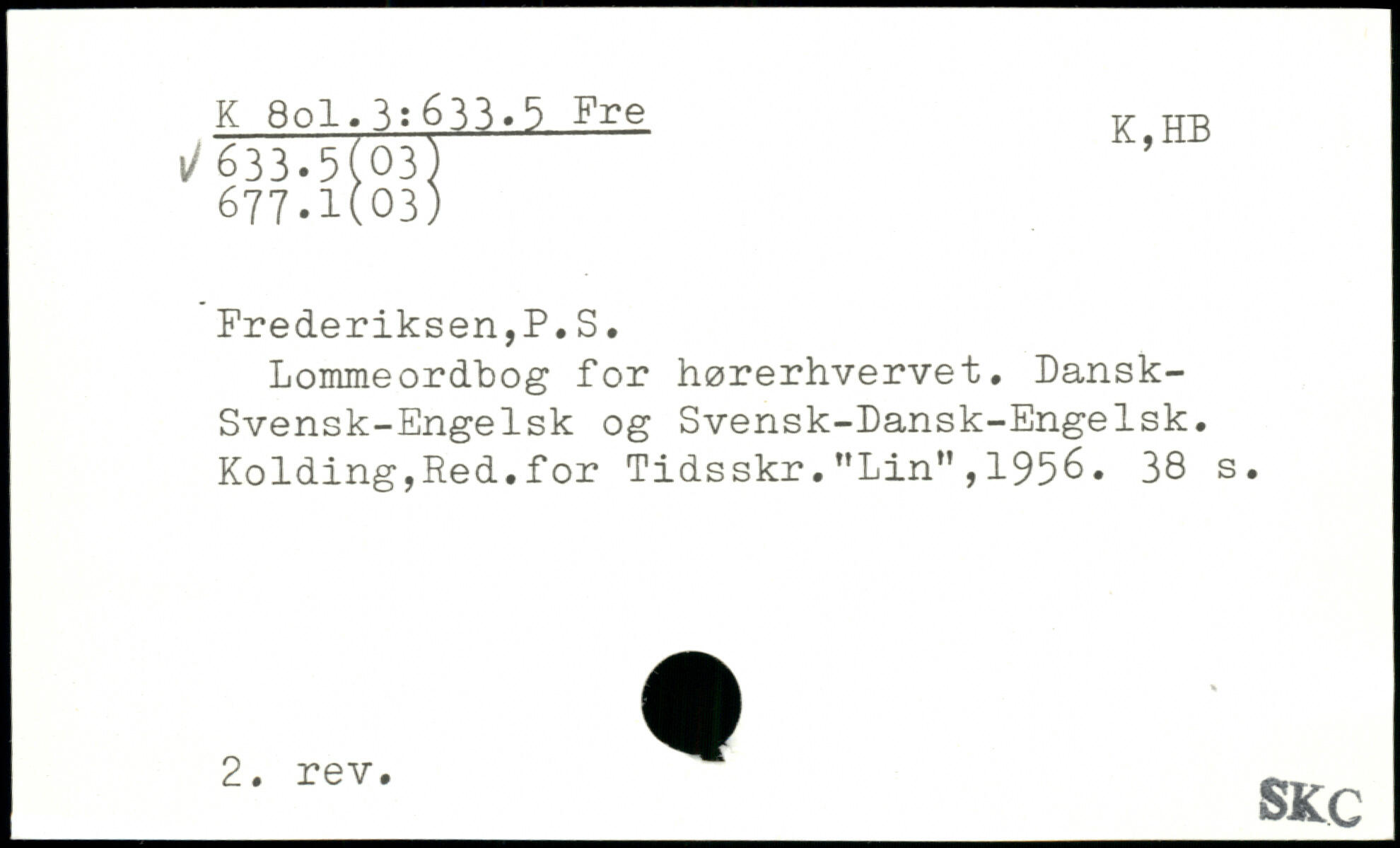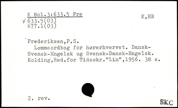 Lommeordbog for hørerhvervet. Dansk-Svensk-Engelsk og Svensk-Dansk-Engelsk. Kolding,Red.for Tidsskr."Lin",1956.