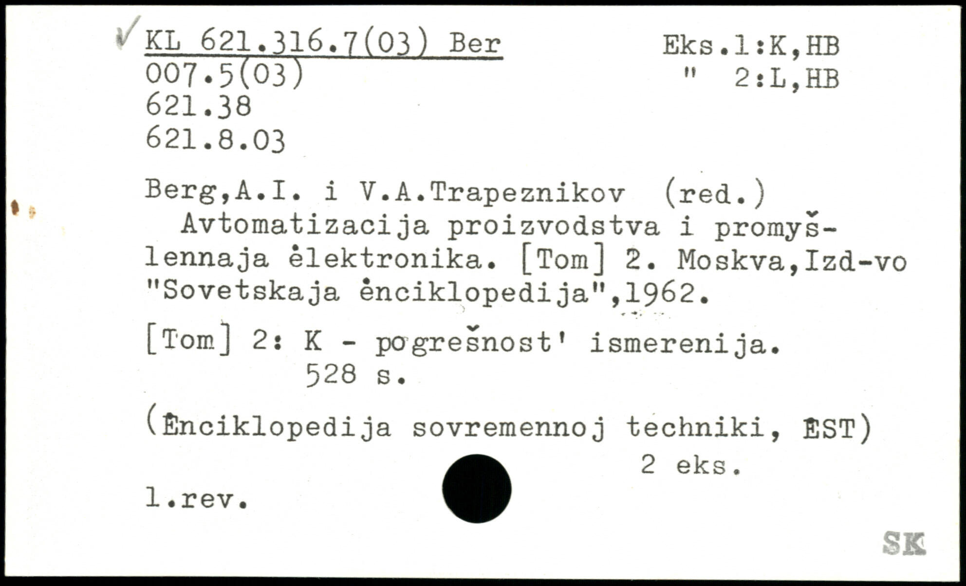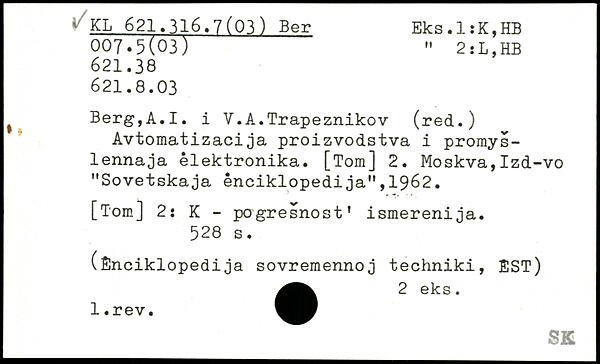 f Berg,A.I. 1 V.A.Trapeznikov (red.) Avtomatizacija proizvodstva i promys-lennaja élektronika. [Tom] 2. Moskva,Izd-vo "Sovetskaja enciklopedija",1962. [Tom] 2: K - pogresnost’ ismerenija.