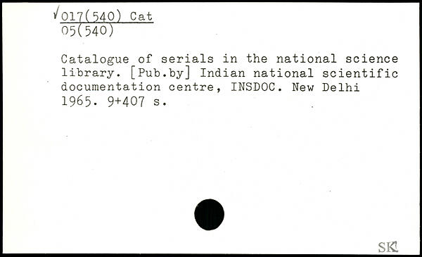 Catalogue of serials in the national science library. [Pub.by] Indian national scientific documentâtion centre, INSDOC. New Delhi 1965.