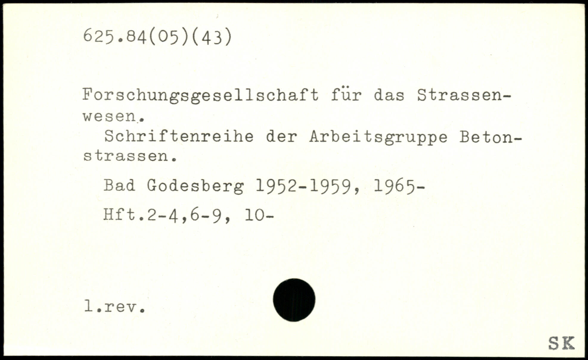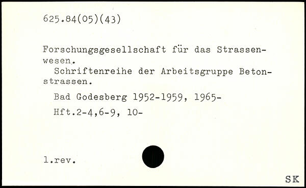 Forschungsgesellschaft für das Strassen-wesen. Schriftenreihe der Arbeitsgruppe Betonstrassen. Bad Godesberg 1952-1959, 1965- Hft.2-4,6-9, 10-