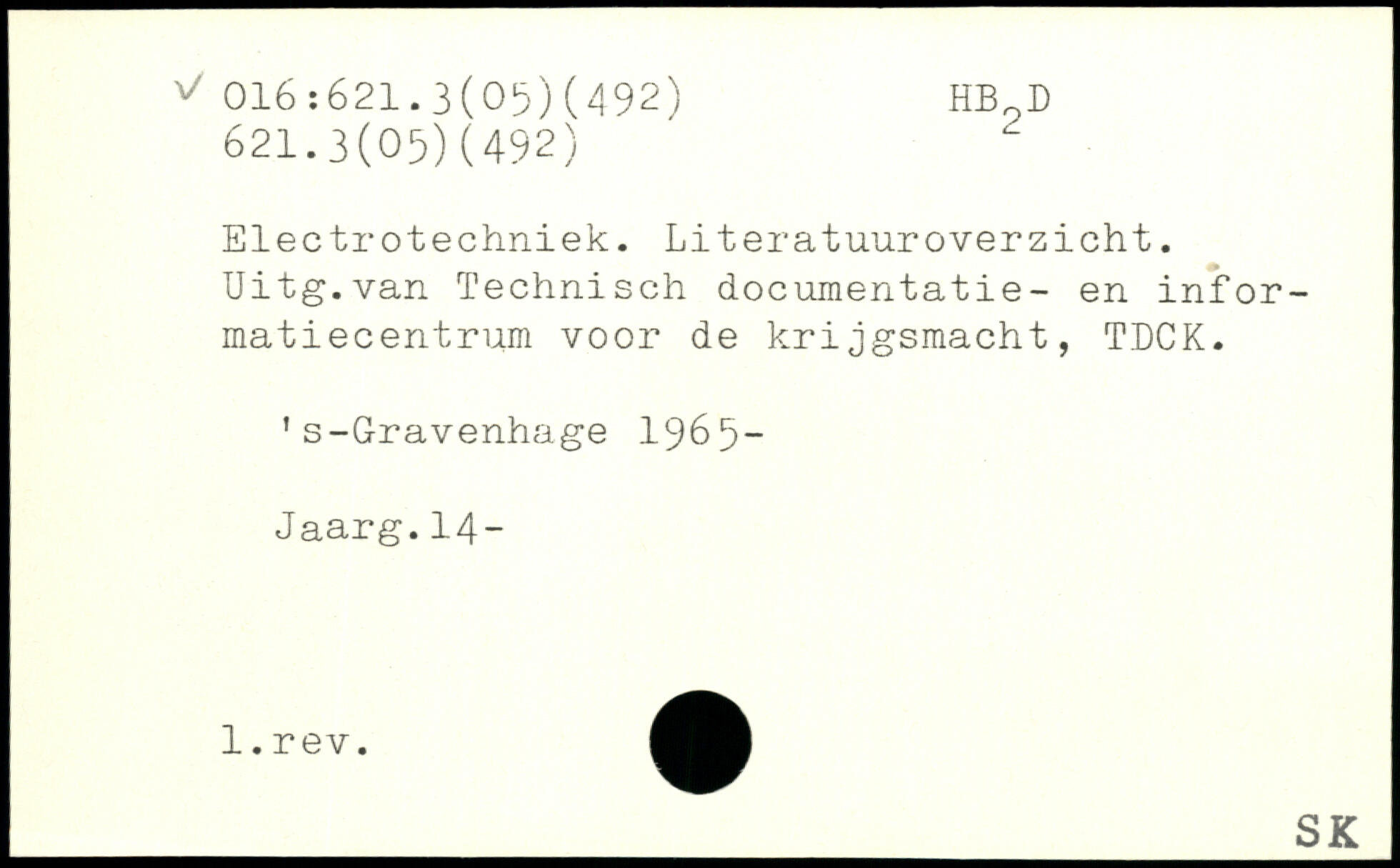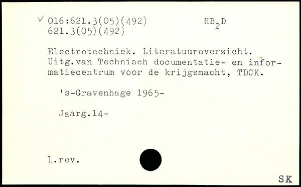 Electrotechniek. Literatuuroverzieht. Uitg.van Technisch docuraentatie- en informat i ec entr um voor de krijgsmacht, TDCK. 1s-Gravenhage 1965- J aarg.I4-