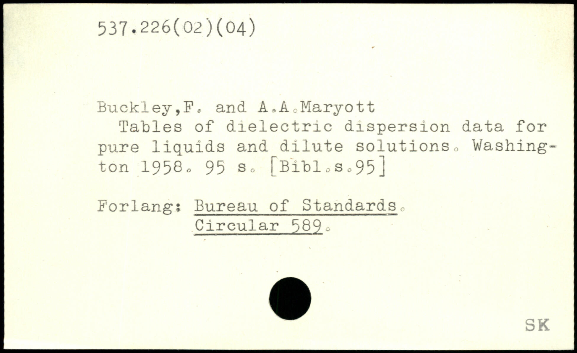Buckley,F, and A.AcMaryott Tables of dielectric dispersion data for pure liquids and dilute solutions