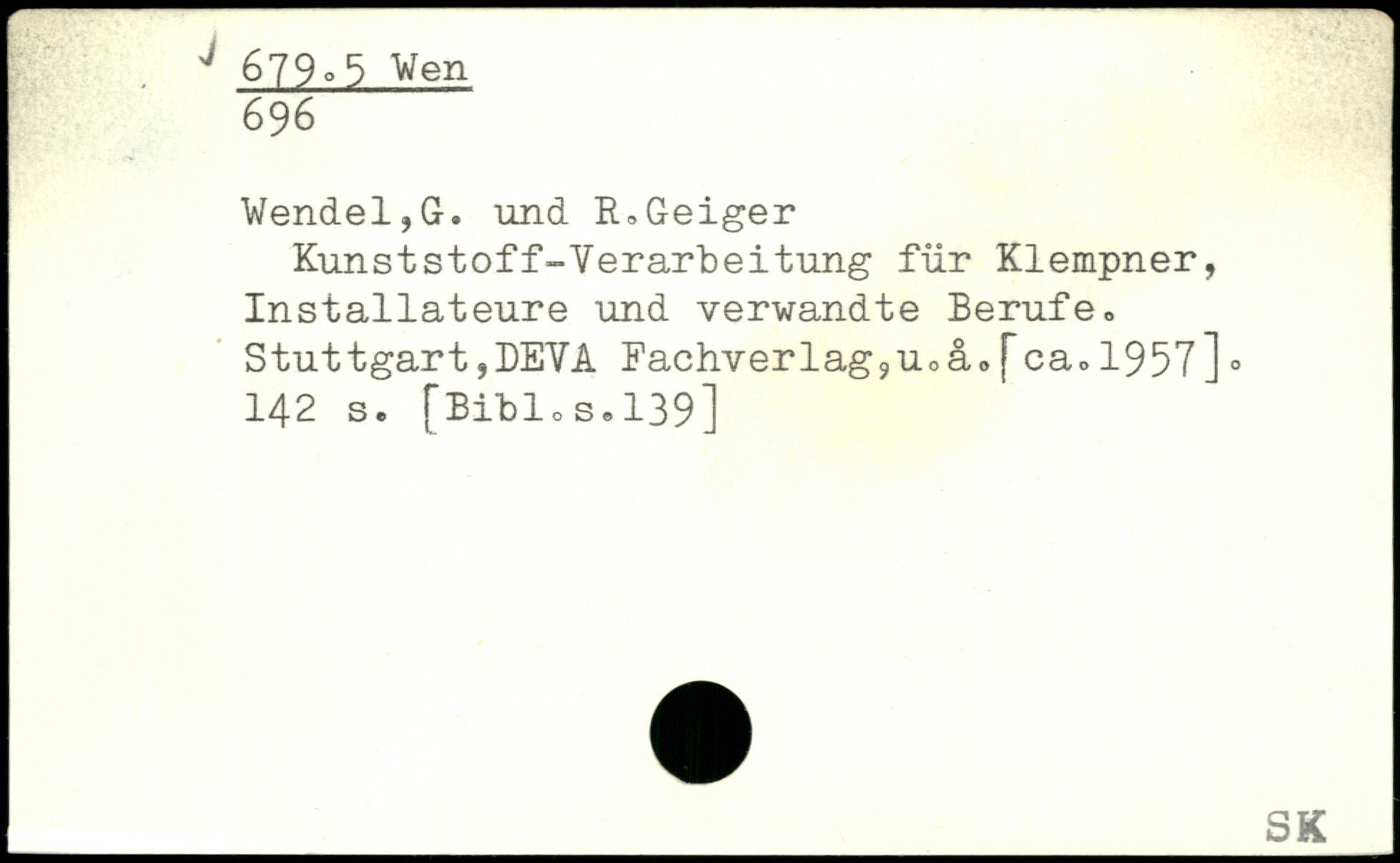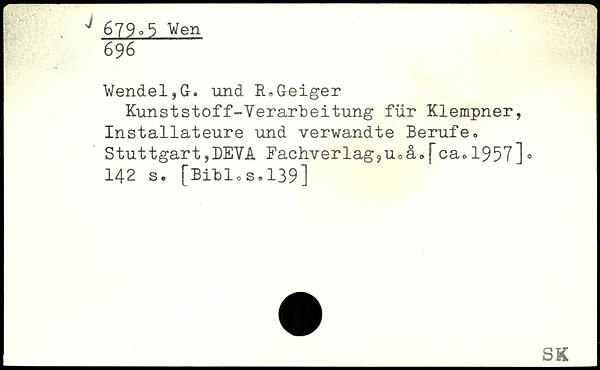 Wendel,G. und R,Geiger Kunststoff-Verarbeitung für Klempner, Installateure und verwandte Berufe. Stuttgart,DEVA Fachverlag,u0a,[ca<>1957].