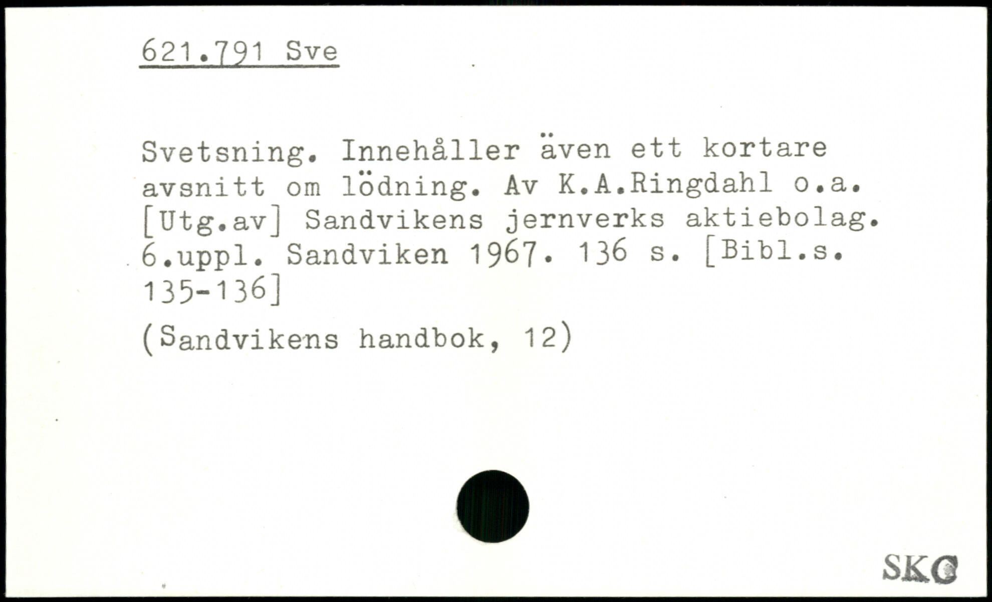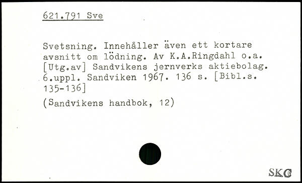 Svetsning. Innehåller aven ett kortare avsnitt om lödning. Av K.A.Ringdahl o.a. [Utg.av] Sandvikens jernverks aktiebolag.