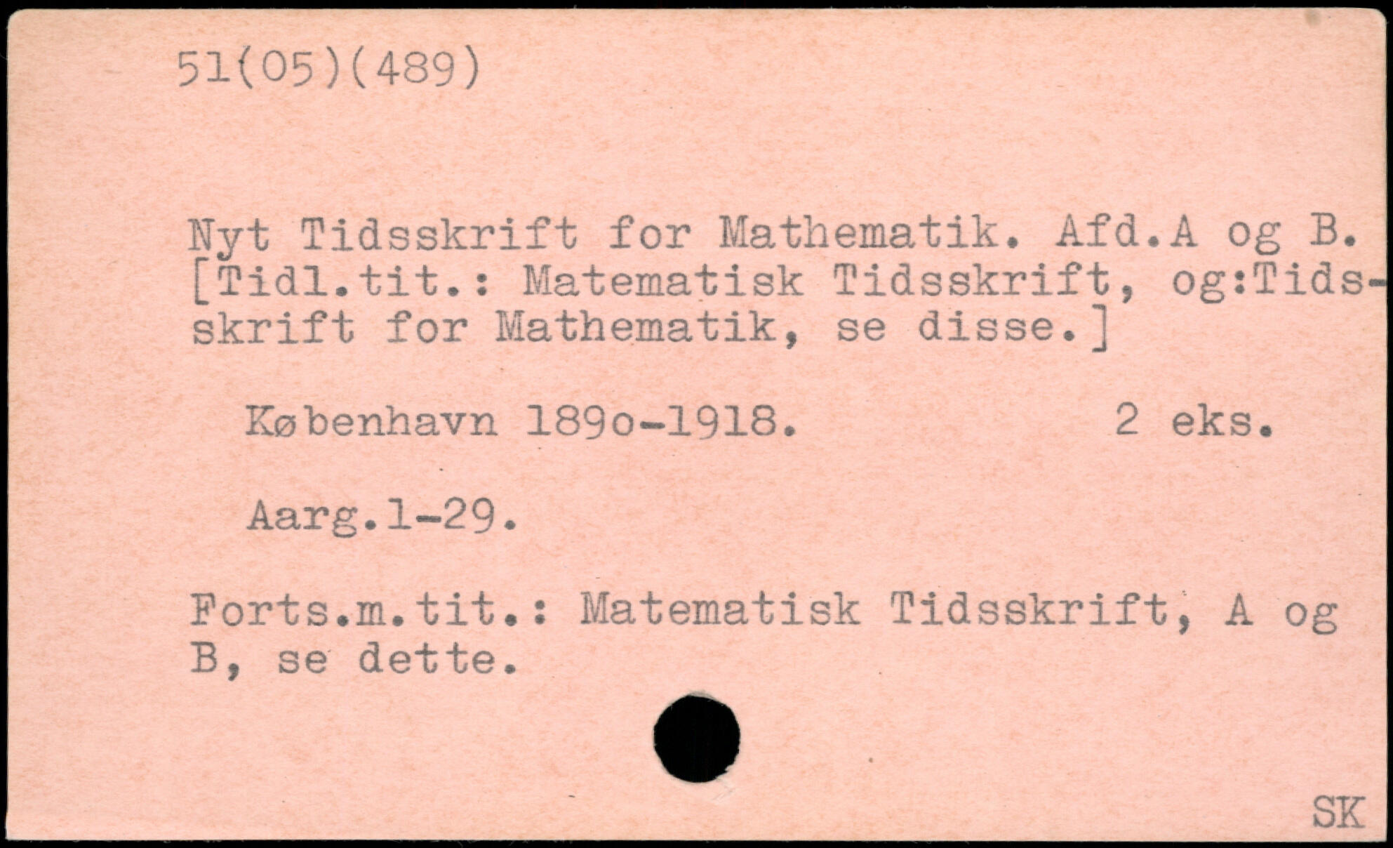 Nyt Tidsskrift for Mathematik. Afd.A og B. [Tidl.tit.: Matematisk Tidsskrift, ogiTids-skrift for Mathematik, se disse.] København 189o-1918. 2 eks. Aarg.1-29. Ports.m.tit.: Matematisk Tidsskrift, A og B, se dette.