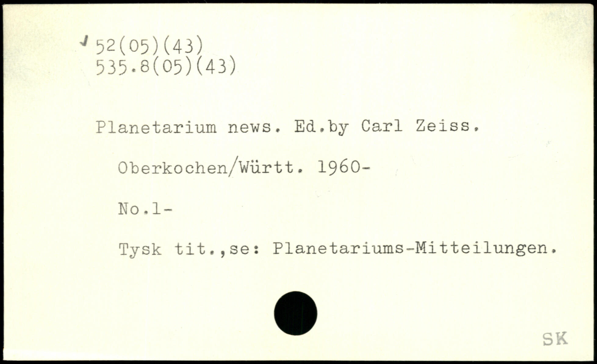 Planetarium news. Ed,by Carl Zeiss, Oberkochen/württ. 1960-Ro.l- Tysk tit.jSe: Planetariums-Mitteilungen.